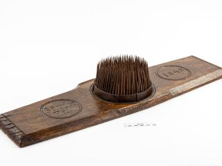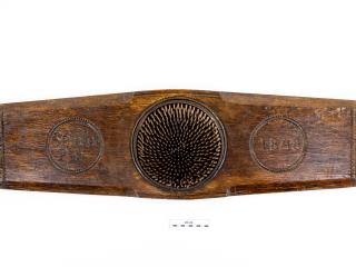 Leírás: tölgyfából készült, csak székre vagy állványra rögzítéssel használható, fogó és kengyel nélküli szegrózsás típus. Szegrózsáját abroncsolás fogja össze, melyet faragás keretez. A szegrózsa jobb és baloldalán faragással keretezett mezőben „