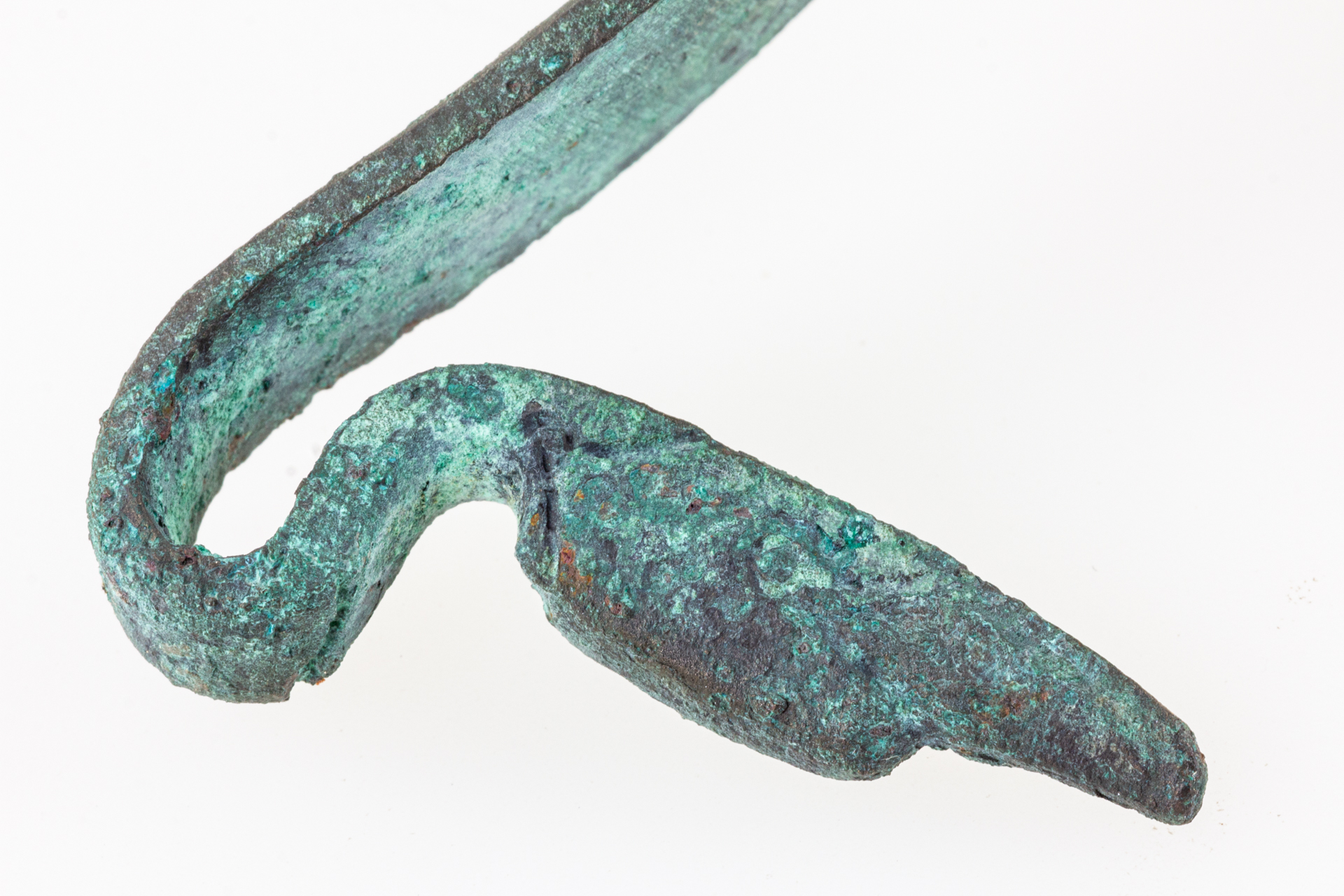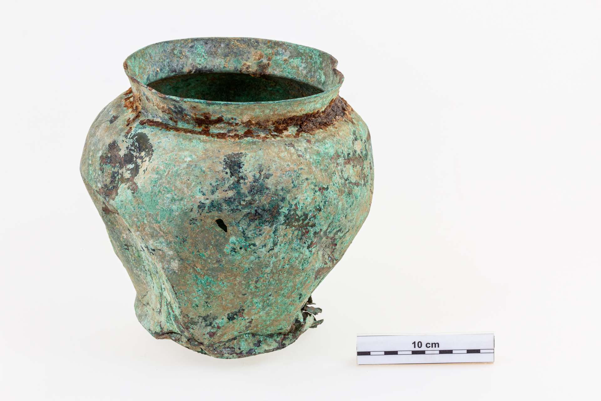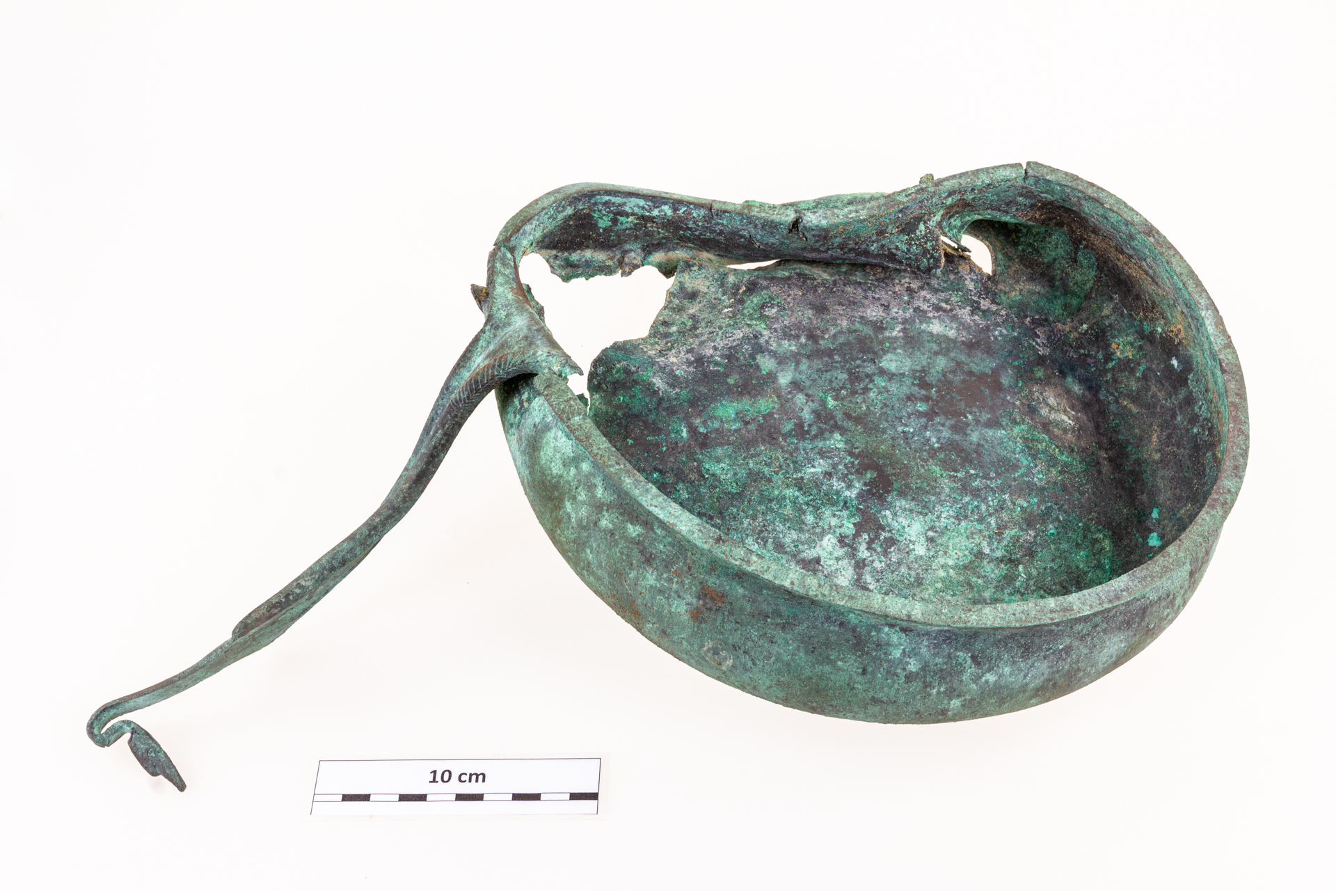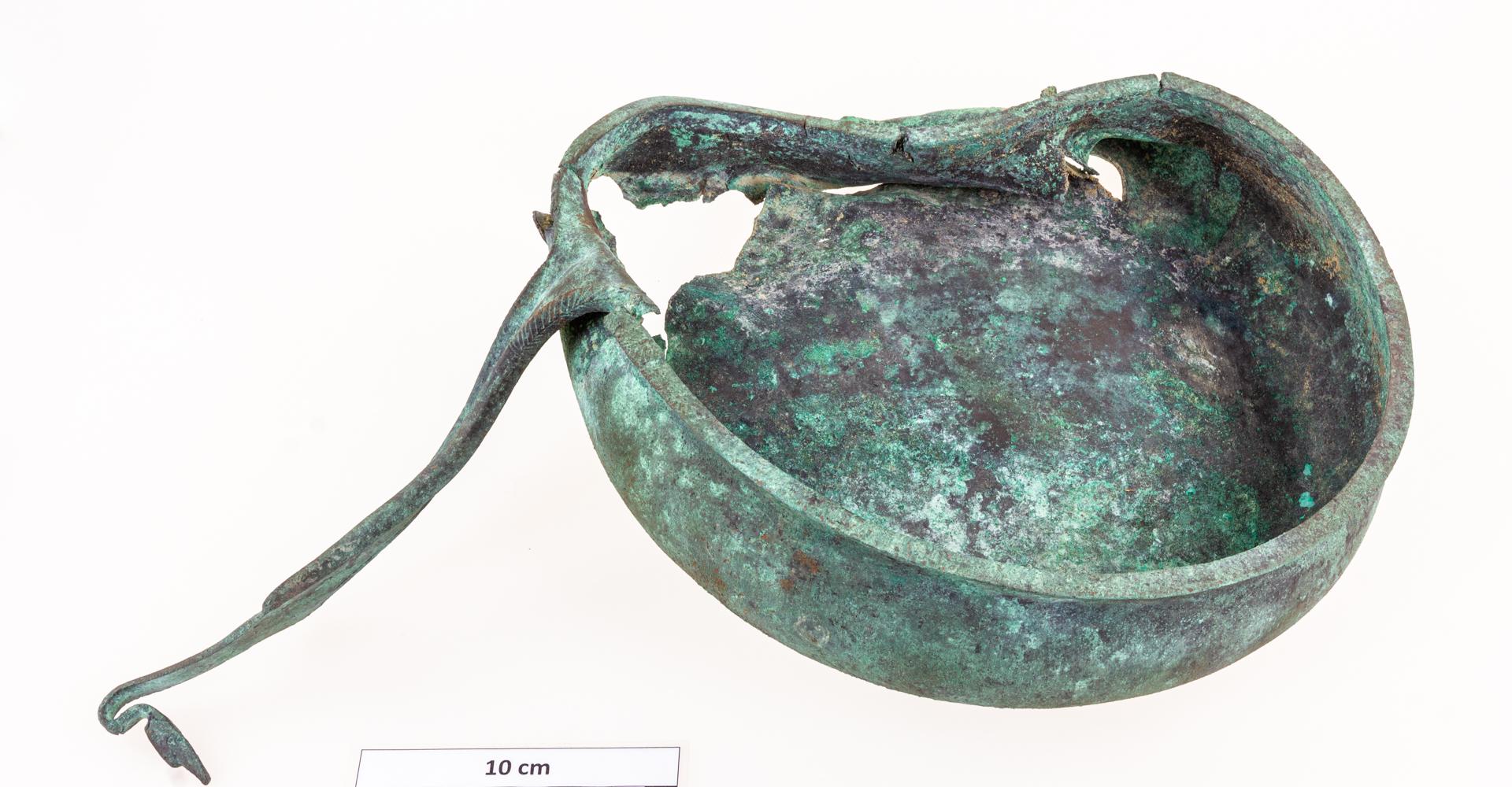 A leletek közül a legérdekesebb darab az itt bemutatott konyhai eszköz: ez a széles, lapos testű serpenyő, amely hosszú nyelének a közepén egy éles gerinc fut, a szélein pedig a testen is megfigyelhető vastagabb perem található. A peremet a nyéltőnél úgynevezett fenyőgallymintával díszítették. A nyél végén lévő jellegzetes visszahajló „hattyúfej” akasztóként is funkcionált. Az öntéssel, majd a serpenyőrész öblössé való kikalapálásával készült tárgy a látható állapotban került a földbe: nyelét elhajlították, a teste is torzult és kilyukadt.