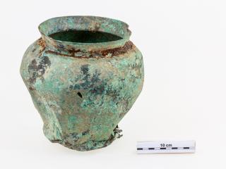 A viszonylag kis átmérőjű ovális alaprajzú gödörben legfelül egy kilyukadt, horpadt, vas füllel ellátott bronz vödör volt, ez alól került elő a szinte kettéhajtott serpenyő, illetve egy vas pajzsdudor. A leletek tisztítása során derült ki, hogy a vödörben további vasdarabok voltak, amelyek közül néhány egy pajzs peremének merevítő vasalatához tartozott, más összeillő darabokat kardhüvely töredékeiként azonosíthatjuk, de egy lándzsahegy köpűje is található közöttük.