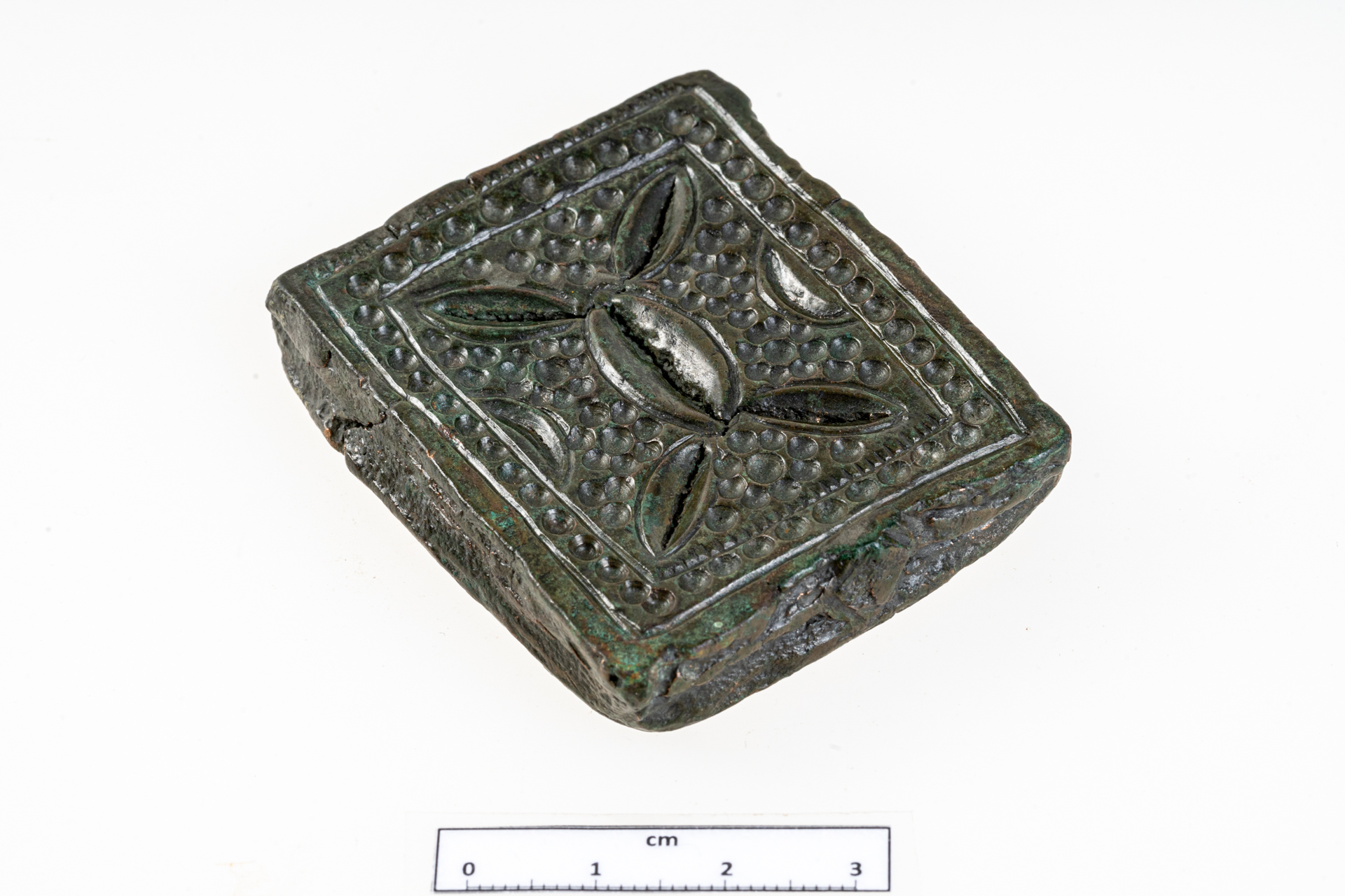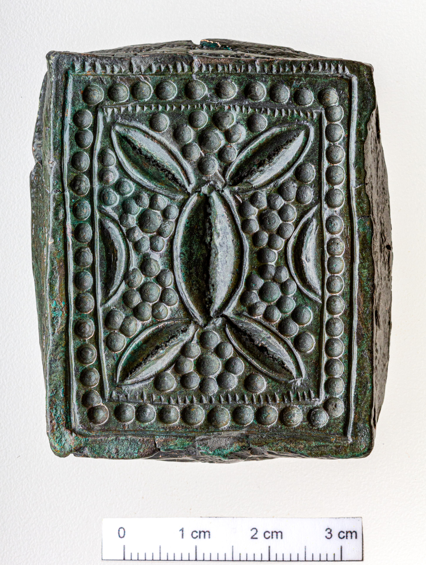 Előlapján kettős keret között bemélyedő félgömbökből álló dísz, az általa közrefogott mező közepén ékvésésszerűen kialakított, mandula alakú mélyedés, ennek két végéhez csatlakozóan, a téglalap sarkainak irányában négy, átlós irányú, hasonló, de kisebb mandula alakú mélyedés. A belső mező téglalapja két hosszanti oldalához csatlakozóan egy-egy félmandula alakú mélyedés. A mandula és félmandula alakú mélyedéseket vésett keretelés veszi körül. A külső keret egyik rövidebb oldalán a bevésett vonal apró rovátkákkal díszített, ahogy a belső keret két rövidebb oldalvonalának befelé eső része is. A mandula alakú nagy dísz két vége mellett a bemélyedő félgömbökből kialakított, hét-, illetve nyolcszirmú virágfej, a mandula alakú dísz alatt és fölött két-két ugyanolyan virágfej, amelyek lényegében egybefolynak a teljes belső mezőt kitöltő, a virágokéhoz hasonlóan bemélyedő félgömbökből álló mustrával. A félgömböcskék átmérője 2 mm, csak a virágok feje nagyobb valamivel, átmérőjük 3 mm.