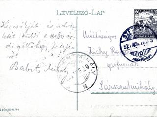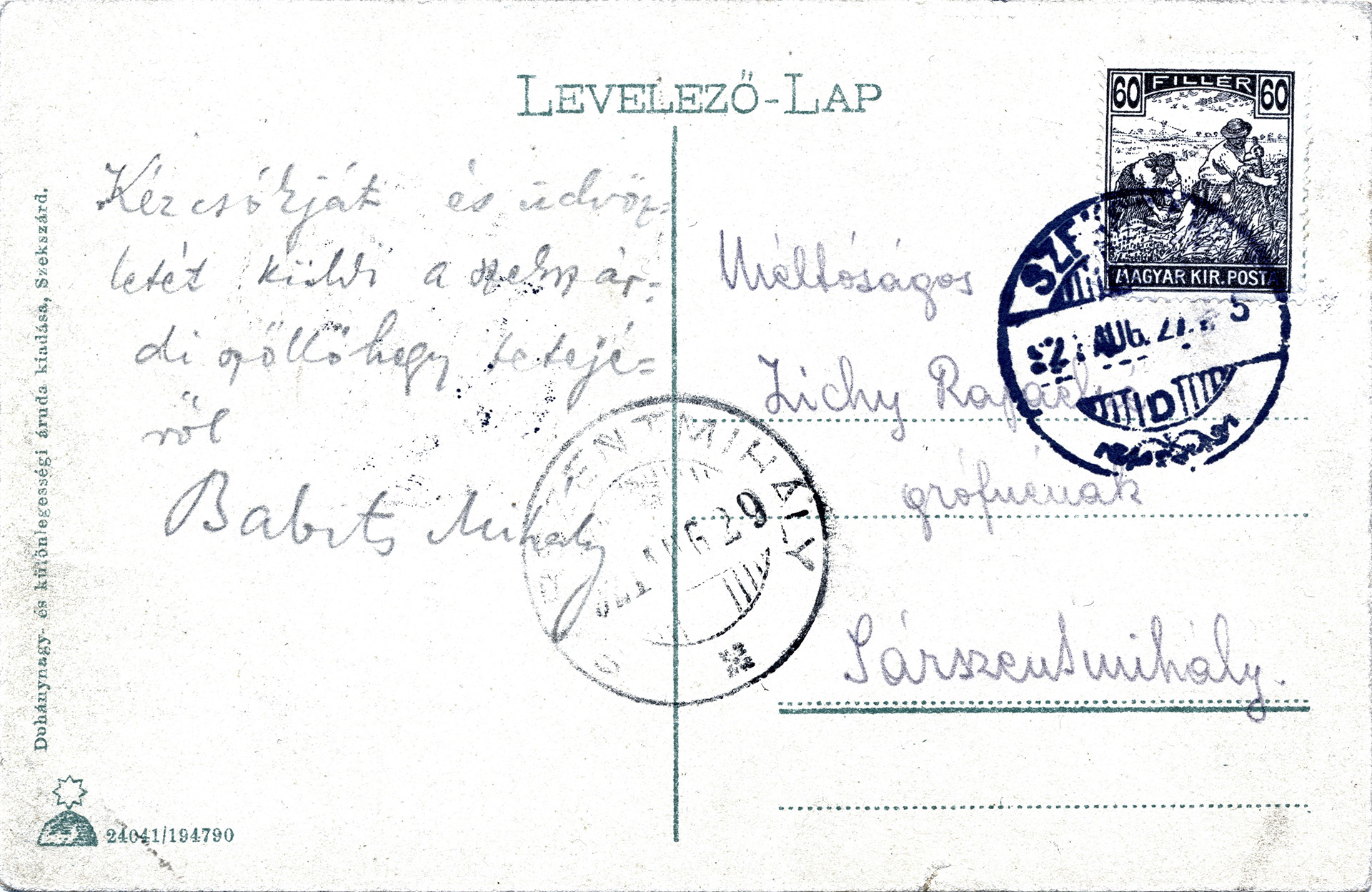 60 filléres barna bélyeggel (arató parasztok) díjmentesítve. Pecsétjei alapján 1921. augusztus 25-én adták fel Szekszárdon és augusztus 29-én érkezett meg címzési helyére. A képeslapot 2021-ben ajándékozta –több más Babits-emlékkel együtt – a Wosinsky Mór Megyei Múzeumnak Kocsis Imre Antal, Szekszárd korábbi polgármestere (1990–2006). A lap szövegét publikálták a Babits levelezését összegyűjtő kritikai kiadásban 2014-ben, 2931. számon. Babits Mihály feleségével együtt 1921 nyarán huzamosabb ideig, július 2. és szeptember 1. között bizonyosan szülővárosában tartózkodott, nagyobbrészt a család birtokában álló présházban, az Előhegyen. Itt kezdte el írni nagy prózai művét, a Halálfiait, mely előbb 1921 októberétől részletekben jelent meg, majd könyv formájában 1927-ben. Török Sophie több felvételt készített itt, a Halálfiait gépelő Babitsról, azonban egy 1921 októberében írott levelében arról tájékoztatja a családot, hogy a helyben vásárolt régi, állott lemezek miatt a fényképek mind elromlottak.