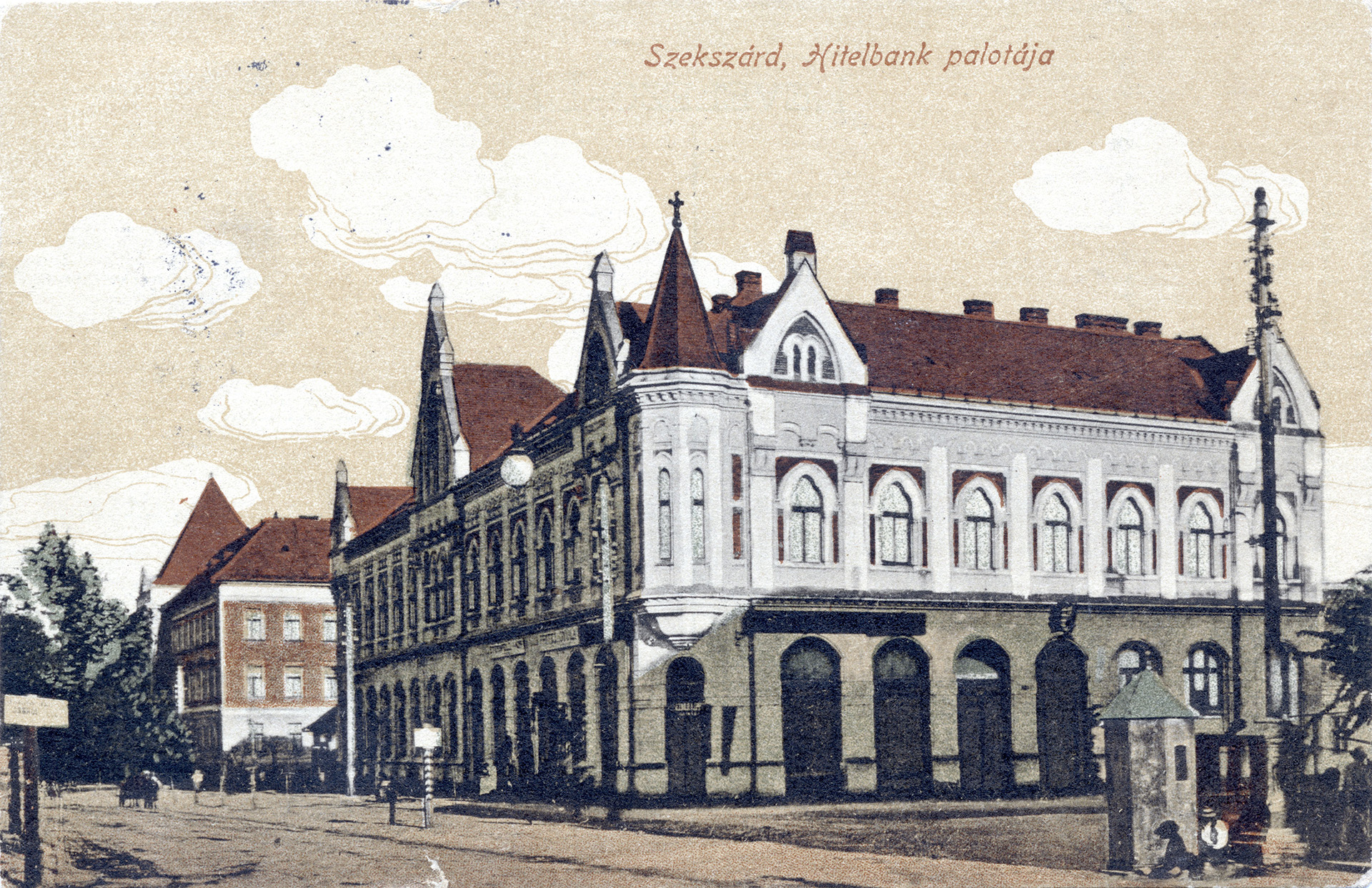 Kézirat gyűjtemény, leltári szám: 2022.1.1. Méret: 14×9 cm Leírás: többszínnyomásos képes levelezőlap. A Dohánynagy- és különlegességi áruda Szekszárd kiadása. Ebből az 1910-es években készült szekszárdi sorozatból eddig nyolcfajta ismert. A bemutatásra kerülő darab a mai Széchenyi utca és a Szent István tér sarkán álló Hitelbankot ábrázolja. Az épület Garay János szülőháza helyén, 1905-ben épült fel Diczenty László tervei alapján. 1911-ben vásárolta meg a Tolnamegyei Takarék- és Hitelbank. A palota mögött a Garay gimnázium épülete, jobb oldalt pedig a Garay tér sarkán egykor álló csendőrposzt kis bódéja látható. A képeslap hátoldalán nyomtatott zöld keret osztja a mezőt. Rajta kézzel, ceruzával az alábbi szöveg: „Kézcsókját és üdvözletét küldi a szekszárdi szöllöhegy tetejéről Babits Mihály”. Szintén a költő írta a címzést: „Méltóságos Zichy Rafaelné grófnénak Sárszentmihály”.