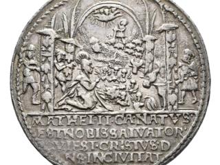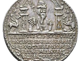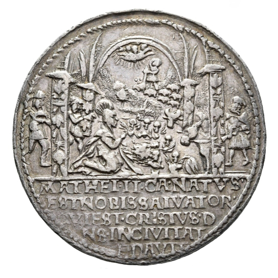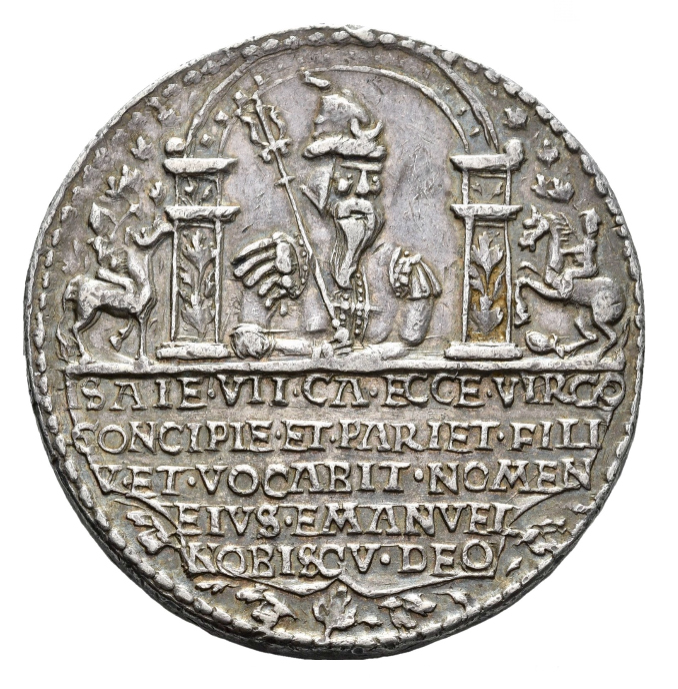 Az érme hátlapján a négyzet sarkára állított, a beteljesült jóslatot ábrázoló kép a fentiek alapján is egyértelműen összefügg az előlappal. Itt a Szent Családot látjuk négyoszlopos, boltíves teremben. A gyermek Krisztus a földre tett drapérián fekszik, arccal a Szűz felé, a térdeplő Mária és József között, a háttérben táj (a méretből adódóan kissé elnagyoltan) állatokkal, pásztorral a domboldalon. Az oszlopokon kívül egy-egy alak található (angyalok vagy pásztorok), a bal oldali kifelé fordulva térdel, a jobb oldali befelé fordulva áll. Legalul hatlevelű rozetta. Az érme jelzés nélküli, de a kidolgozás minősége és a párhuzamok alapján valószínűleg Füssel Kristóf (Christof Füssl/Fueszl) verte Körmöcbányán, az évszám szerint 1551-ben. A jelenleg is működő körmöcbányai (ma Kremnica, Szlovákia) pénzverdéje 1328-as alapítását követően a királyi Magyarország legjelentősebb ilyen jellegű intézménye volt, amelynek, illetve a városnak a történetében kiemelkedő szerepet töltött be Füssel Kristóf.