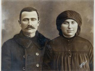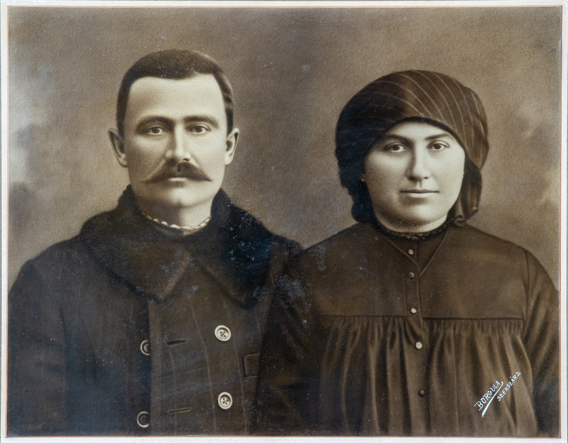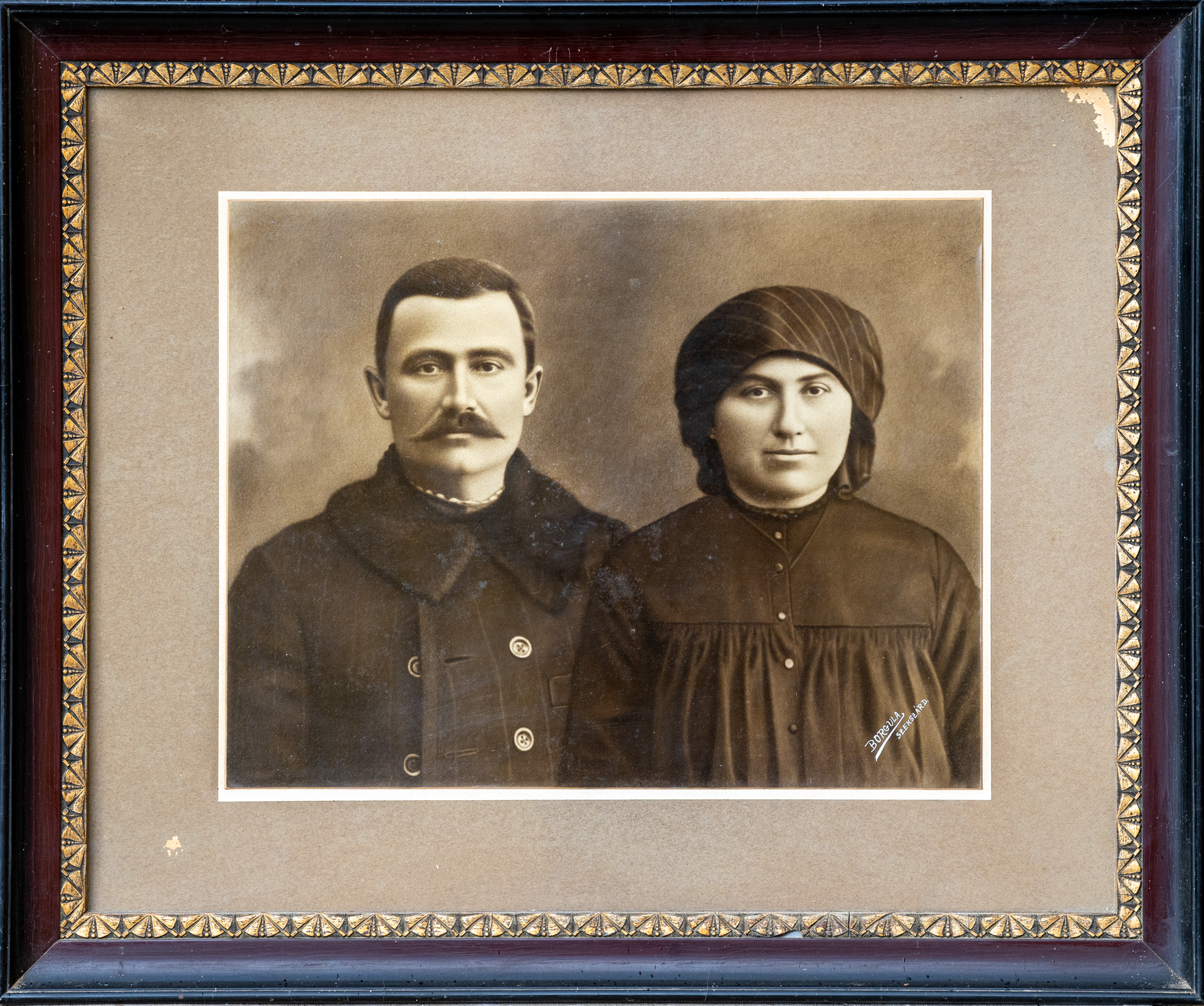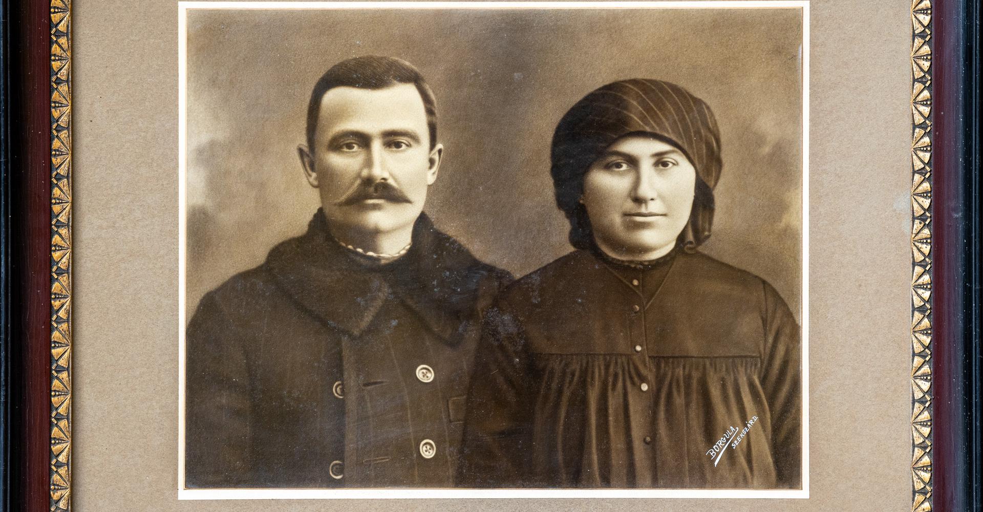 Leírás: díszes, gipszmintás keretben Magyar Pál és felesége, Hajdú Éva fényképe A keretes képet több tárggyal együtt 2021 augusztusában ajándékozta a múzeumnak Magyar Pál, nyugalmazott ügyész, a képen szereplők dédunokája a család volt őcsényi hegyi, ma Szekszárd-Szőlőhegy, Harang utcai tanyájából.