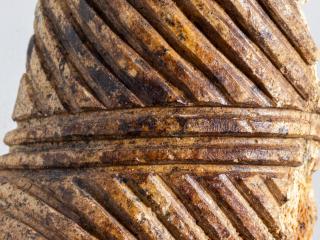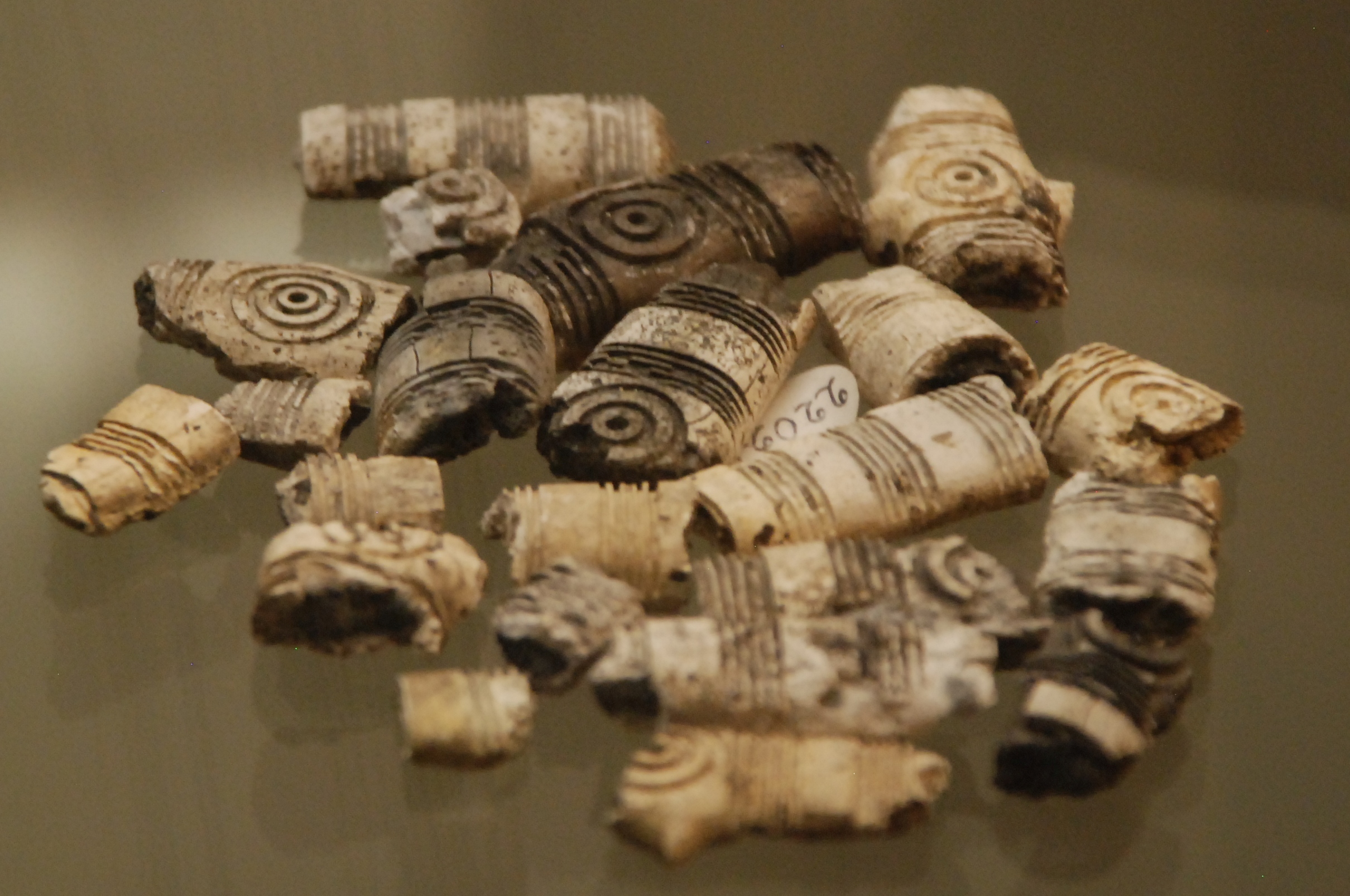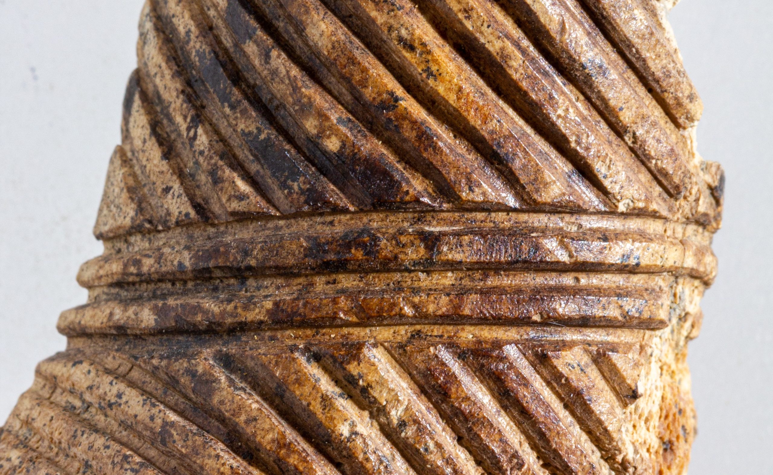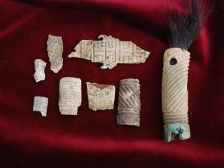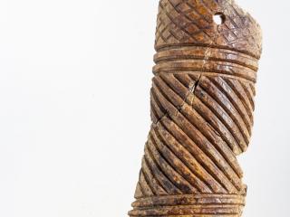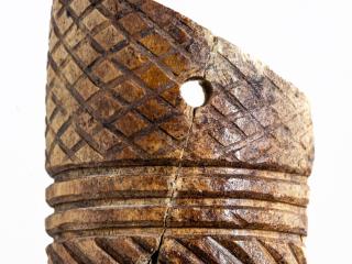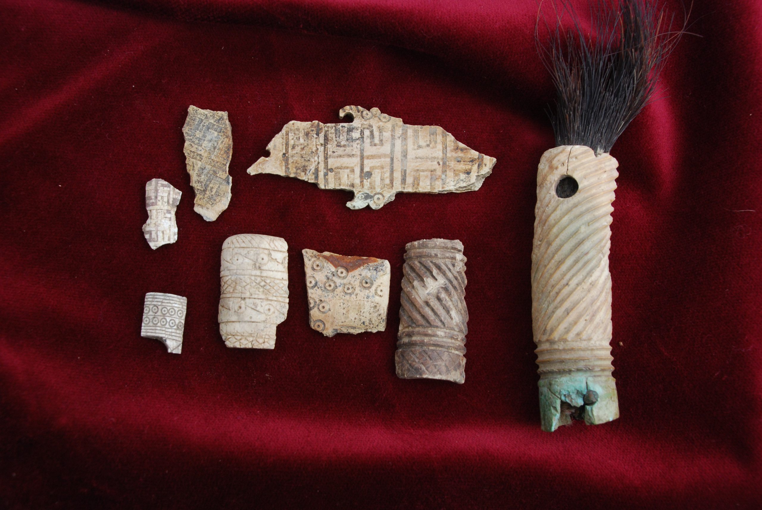 A lelet három darabból ragasztott, a Kr. e. 7. század második felére keltezhető. A csizmadarabbal együtt gyűjtött tárgyak között egészen sajátos egy másik faragvány története is. A ferde- és körbefutó kannelúra-köteggel díszített csonthengerbe az egykor a telken lakó férfiember másodlagosan szőrt dugott, és borotvapamacsnak használta. Az elnéptelenedett házban a rag alól került elő. További, hasonló technikával díszített faragványok töredékei is szép számban vannak az anyagban. Mindezek teljesen egyedülálló leletek a Kárpát-medencében, mint a ferdén, szélesen kannelúrázott töredékek, köztük az egyik 4 cm hosszú, 1,5 cm széles félhengeres tárgy részlete, valamint a pikkelypáncélzat alsó díszítősorához tartozó, geometrikus díszítésű, trapéz alakú lemez is. Egy vékony falú, egész felületén nagyon finom geometrikus mintákkal díszített tárgyon pedig különösen jól látható a piros színű festés nyoma. A faragványok mintegy harmada pontkörös díszítésű. A korabeli ábrázolásokon jól látható, hogy a puha bőrből varrt, felfelé kunkorodó orrú csizma az ókori Keleten és a sztyeppén a szkítáknál is széles körben elterjedt. A regölyi pannon tumulus feltárása során további szarvasagancsból készített votív csizmafaragvány is előkerült, melyen szintén jól megfigyelhető az egykori viselet: mindkét esetben olyan ballábas faragvány került elő, amelyen puha bőrből varrt, felkunkorodó orrú csizma látható.