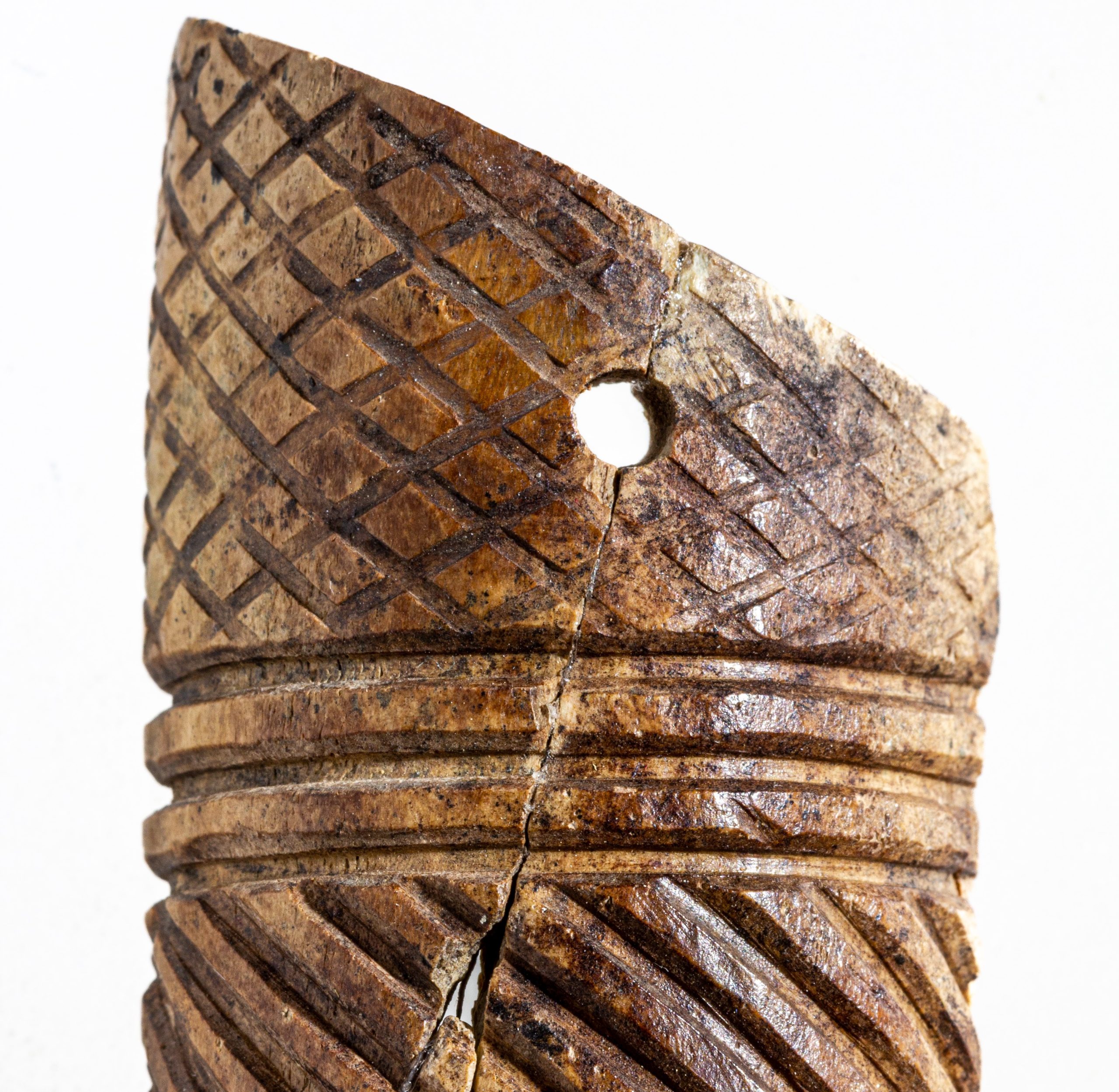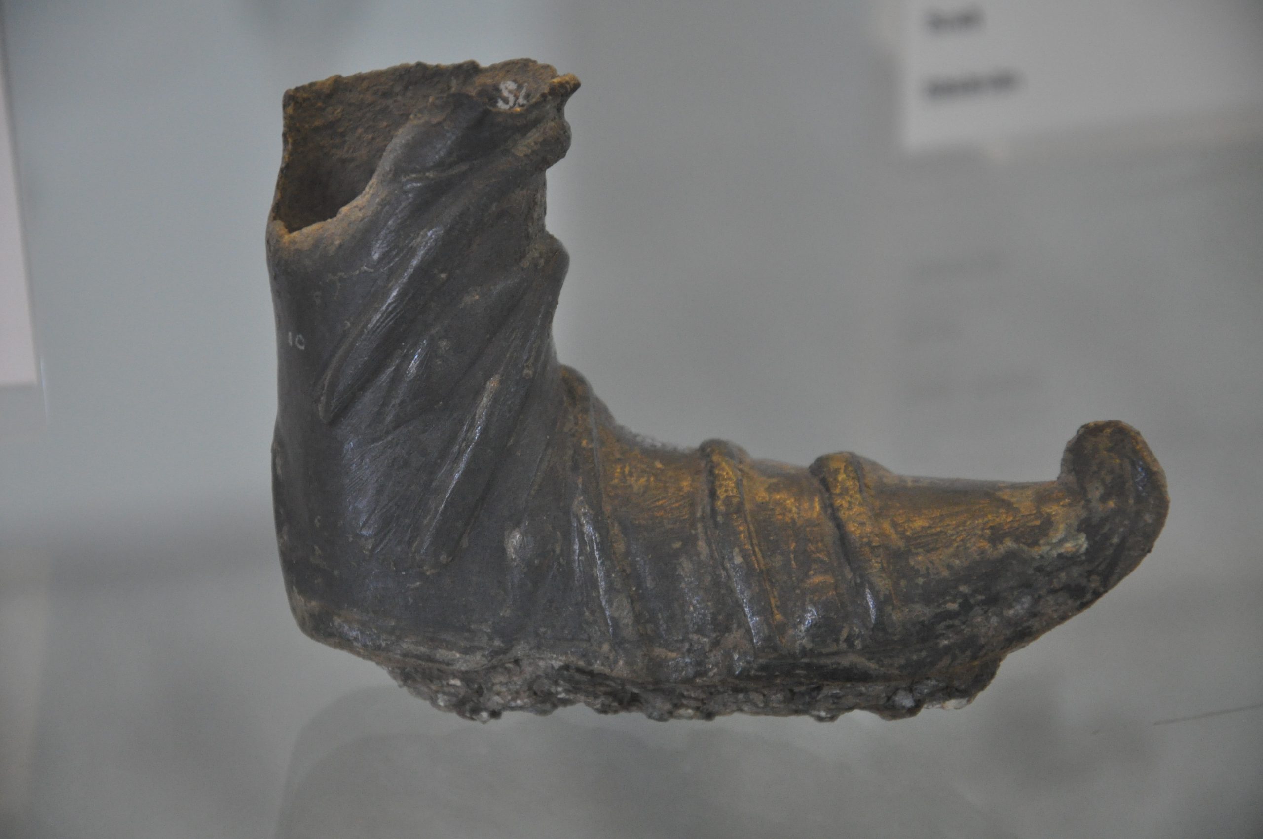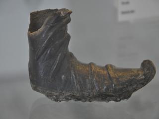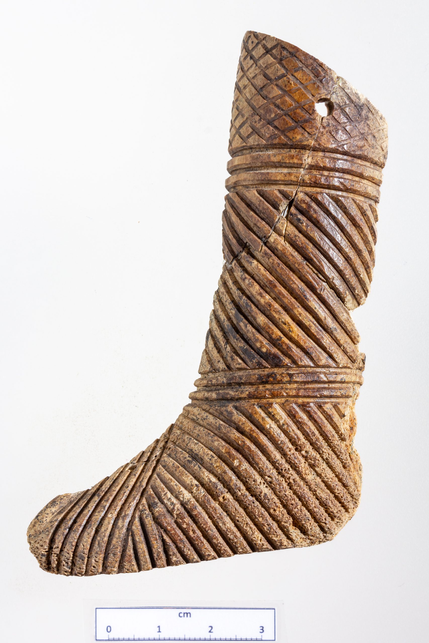 Régészeti gyűjtemény, leltári szám: Ö 2012.9.1. Méret: hosszúsága: 10,1 cm; szélessége a lábfejnél: 6,2 cm, a száránál: 2,9 cm; vastagsága: 2,4 cm Lelőhely: Regöly-Strupka-Magyar birtok „… az Isztroszon túl egyetlen nép lakik, a méd viseletben járó szigünnák.” (Hérodotosz V.9.) Cziráki Viktor már gyerekkorától gyűjtötte Regölyben, a Strupka-Magyar házaspár Kölcsey utca 34. szám alatti házának udvarán álló halom ólakkal, pincével bolygatott rétegeiből kipergő szkíta kori régészeti leleteket. A tumulus feltárásának megkezdésekor gyűjteményét a szekszárdi múzeumnak ajándékozta. Az általa talált, szarvasagancsból faragott kis csizma alakú tárgytöredéknek a halom rétegeinek bontása során előkerült a szárrészből hiányzó darabja is, ezért a szórványnak tekinthető tárgyak közül az RHQ9 réteg zárt anyagához soroltuk át (RAQ9.1.). A csizmafaragvány orra hegyes, felfelé kunkorodó, amit a lábfej középvonaláról V alakban lefutó vésett díszítés is kiemel. A szár rész alsó felén V alakú vonaldíszek, felette párhuzamos vonalak, illetve hálóminta van, a szár teteje átfúrt.