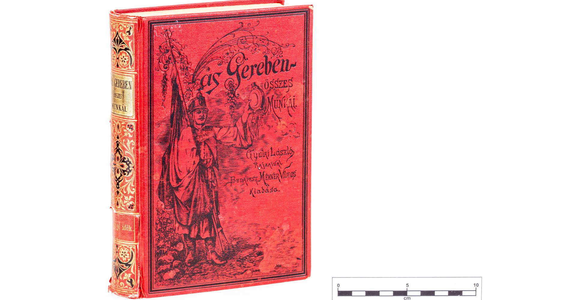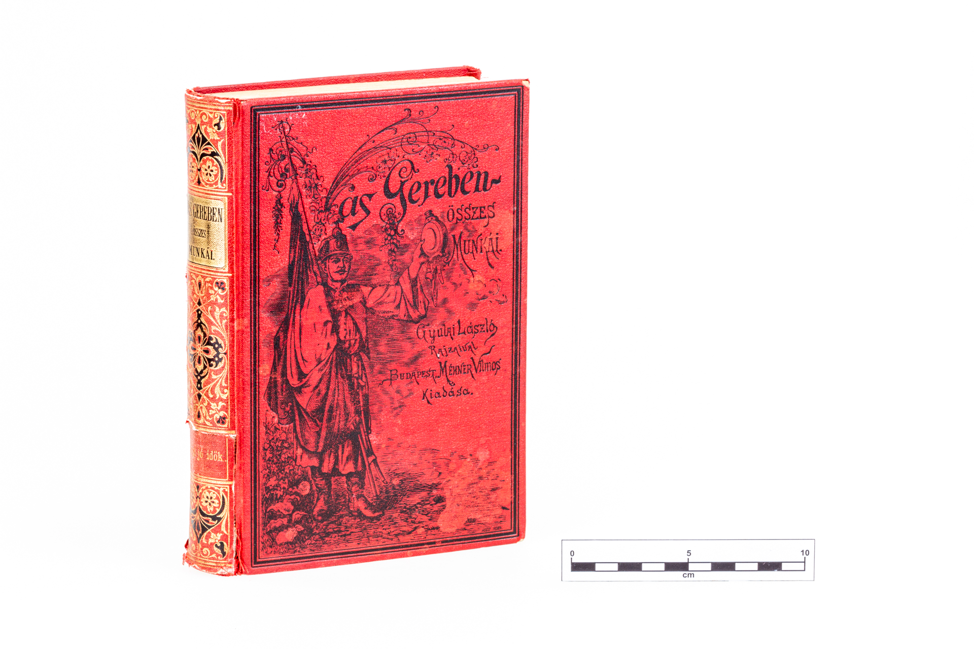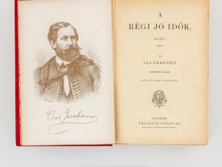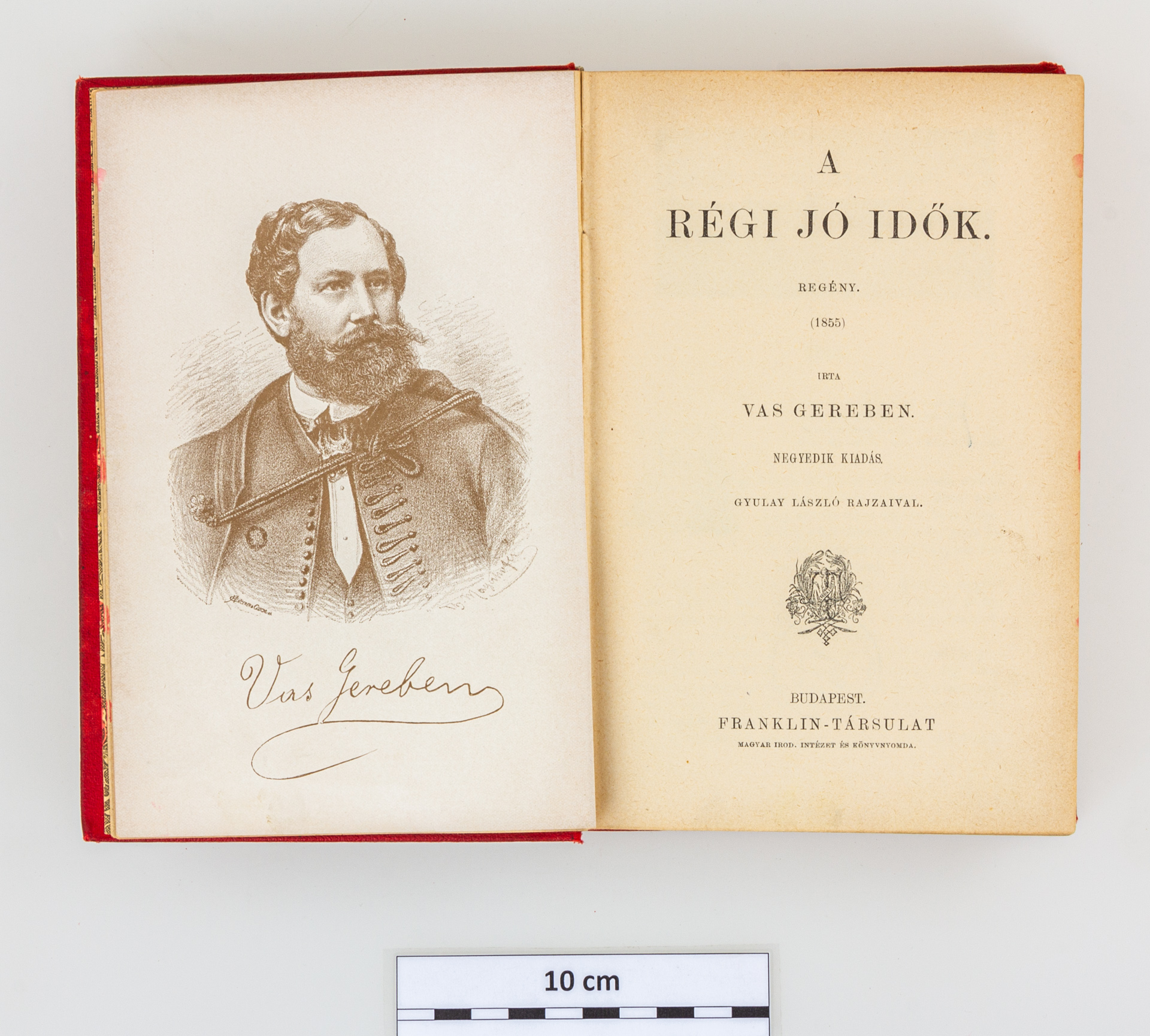 A kiállított könyv adatai: Kiadás helye, ideje: Budapest, 1886 Kiadó: Franklin Társulat, 4. kiadás Mérete: 20x15 cm Oldalak száma: 492, számos fekete-fehér szövegközi és néhány egész oldalas illusztrációval Típus: nyomtatott könyvlapok; aranyozott gerincű kiadói egészvászon-kötés; a borítón dombornyomás; állapota kopottas Teljes cím: Vas Gereben összes munkái. Képes kiadás. I. kötet.