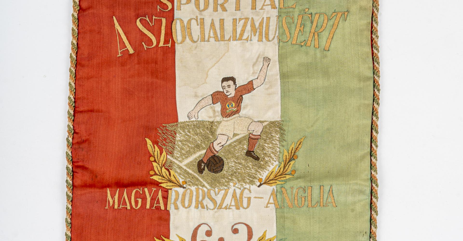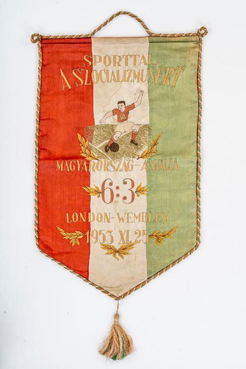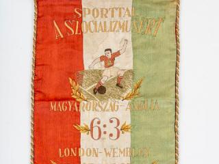 Nemzeti színű, ötszögletű, hímzett selyem sportzászló. 1969 augusztusában a Megyei Testnevelési és Sporttanácstól került a Wosinsky Mór Múzeum újkortörténeti gyűjteményébe. Ráhímzett futballjátékos díszíti. Felirata: Sporttal a szocializmusért és Magyarország – Anglia 6:3 London-Wembley 1953. XI. 25.
