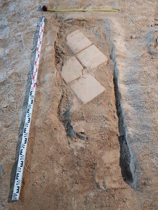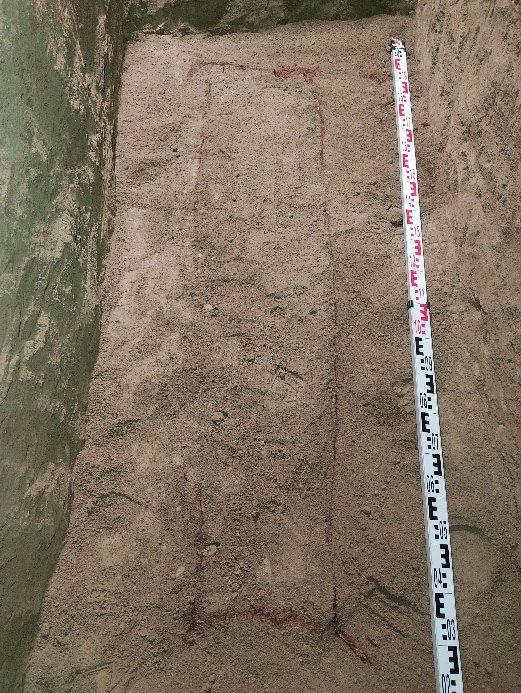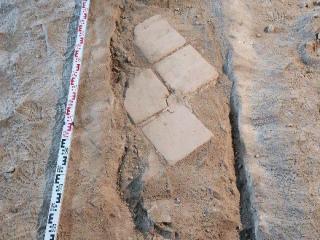 A temetkezés feltárásának kezdetén kiderült, hogy a sír már valamikor régen megsüllyedt, mert négy, habarcsba rakott padlótéglával egyenlítették ki a gödör felső részének megrokkanását (4. kép). A téglák alatti habarcsból 1812-es krajcár került elő, tehát az 1725-ben ásott sír már egy évszázaddal később látványosan megsüllyedhetett. A sírgödör egyik sarkán félkör alakú, valószínűleg tudatosan kialakított kiugrást találtunk, ami lejjebb egy kis padkába ment át: talán a sírásók készítették lépcső gyanánt. (Itt érdemes megemlíteni, hogy a sír falának kemény földjében jól kivehetők voltak a 18. századi szerszámok lenyomatai is.)
