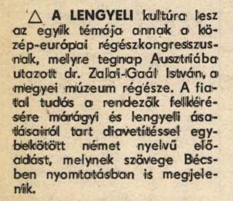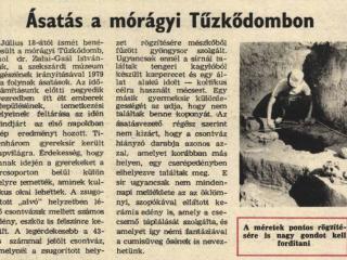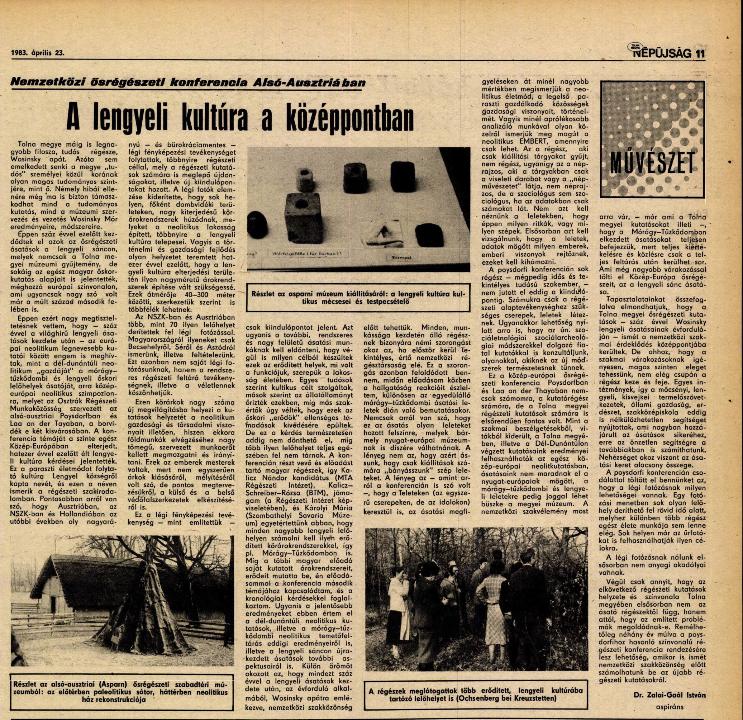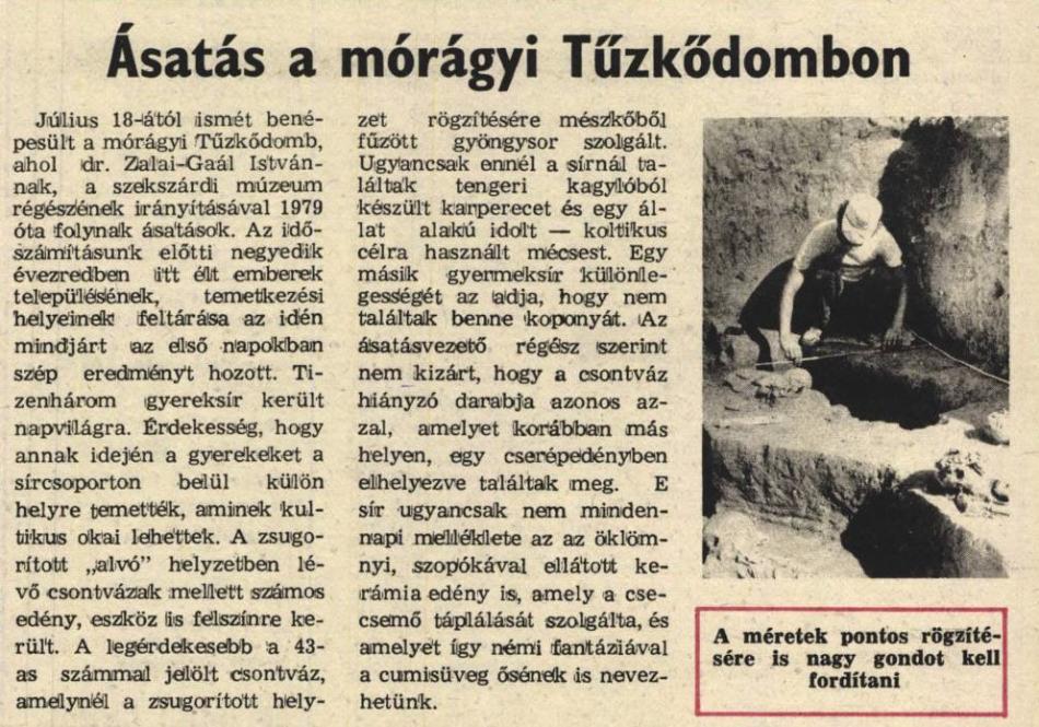 A régészeti feltárás, a régészeti tábor eredményeiről is beszámoltak az olvasóknak az évi helyszíni munka befejezése után, július 20-án jelent meg ismét egy képes tudósítás „A lengyeli ásatótábor eredményei” címmel.[6] (2. melléklet) A mórágyi Tűzkődombon folytatott munkáról is tudósított a helyi sajtó.[7] A temető sírjai igen sok érdekes jelenséget, leletet tartalmaztak, köztük a minden bizonnyal a csecsemők itatására szolgáló edényt is. A cikkben lévő fotón Dr. Zalai-Gaál István láthatjuk sírfeltárás közben. (7. melléklet) A folyó munkákat 1983-ban a hazánkba érkező német kutatók is megtekintették.[8] (6. melléklet)