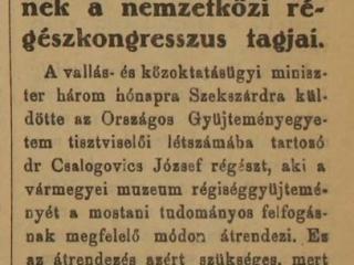 A régészeket a vacsoránál dr. Hagymássy Zoltán főispán németül, a régészek nemzetközi nyelvén üdvözölte a vármegye és Szekszárd nevében és a kedves köszöntőre Dr. Goessler Péter [1872–1956] stuttgarti egyetemi tanár válaszolt, míg később dr. Syme Ronald oxfordi 1903–1989] egyetemi tanár mondott pohárköszöntőt a magyarokra. A társaság a szekszárdi szőlősgazdák által rendelkezésre bocsátott jobbnál jobb borok mellett a legjobb hangulatban éjfélig maradt együtt. – Dr. Csalogovits kalauzolása mellett vasárnap reggel megtekintették a muzeumot, amelynek nemcsak őskori gyűjteményétől voltak elragadtatva, hanem meglepetéssel tanulmányozták a római kori anyag unicumait is. A muzeumból kimentek a Szigeth pusztára, ahol a castrumot tanulmányozták, majd Őcsényt és Decset keresték fel, ahol gyönyörködtek az eredeti ősi népviseletben. Szekszárdra visszatérve megköszönték a szives fogadtatást, majd egy részük Lengyelre ment át az őskori telepre, másik részük pedig Várdombra, ahonnan Dunaszekcsőn keresztül utaztak Pécsre. Pécsről kedden reggel mentek vonaton Eszékre.” (Tolnamegyei Ujság 1933. szeptember 27-ei tudósítása)