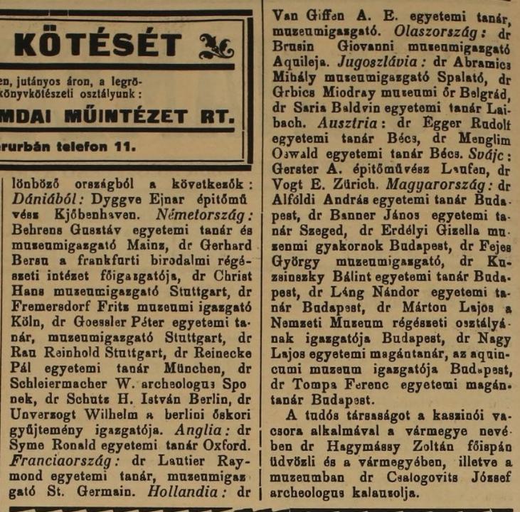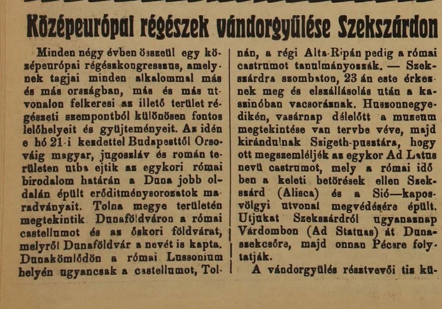 „A régészek megszemlélték Dunaföldvár római castellumát, az őskori földvárat, a dunakömlődi castellumot, Tolnán a római castrumot és estefelé érkeztek Szekszárdra, ahol elfoglalták a Szekszárd Szállóban lefoglalt szállásaikat, majd vacsorára a Szekszárdi Kaszinó emeleti termében gyűltek össze, ahol velük együtt jelen volt dr. Hagymássy Zoltán főispán, dr. Holub József egyetemi tanár, vitéz Vendel István polgármester, Bodnár István, a Kaszinó igazgatója, dr. Bolgár Kálmán törvényszéki bíró, a Kaszinó gazdája, dr. Künsztler Károly árvaszéki ülnök és dr. Csalogovits József archaeológus, a szekszárdi muzeum átrendezésével megbízott gyűjteményegyetemi tisztviselő.