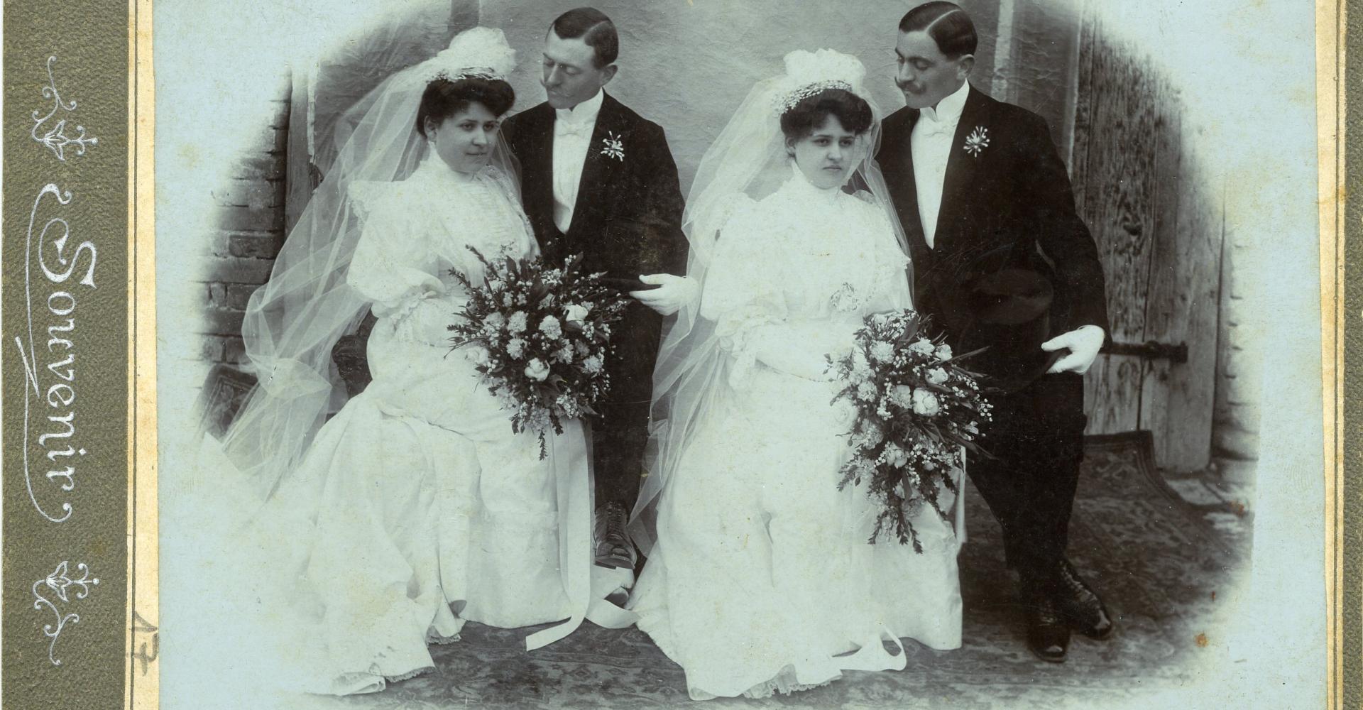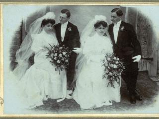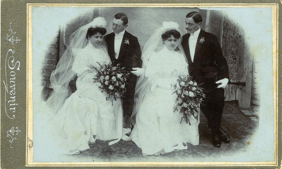 Most ismét két pár esküvői fotóját mutatjuk be. Első pillantásra mintha sztereó felvételt látnánk, olyan nagy a hasonlóság közöttük. Ne csodálkozzunk, itt egy testvérpár kért meg egy testvérpárt: a tolnai Perler Ernő és József vette feleségül Ketterer Ilonát és Etelkát. Már az eljegyzés hírét is felkapta a sajtó: „Kettős eljegyzés. A maga nemében ritka eljegyzési ünnepélyt tartott Tolnán Perler Keresztély vállalkozó, kinek két életre való fia: Ernő és Józsi jegyet váltott Ketterer Antal tolnai pékmester csinos leányaival: Ilonkával és Etelkával. Nagykarácsony napján a karácsonyfa alatt történt a kézfogó, mely után az egybegyült rokonság lakomához ült és vig pohárköszöntők mellett töltötte el a kellemes estélyt. Csak az a kár, hogy az egyik vőlegény, még a katonai uniformist kénytelen viselni s nem tudja, mikor bocsájtják haza. Lévén ő ugyanis harmadéves katona, ki a volt ex-lexnek bűnbakja. Egyébként tartós boldogságot kívánunk a kötött frigyhez” – írta a Tolnamegyei Közlöny 1907. január 10-én.