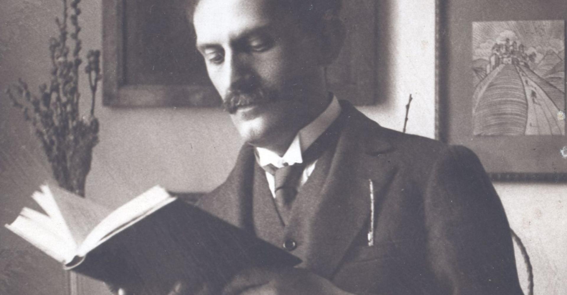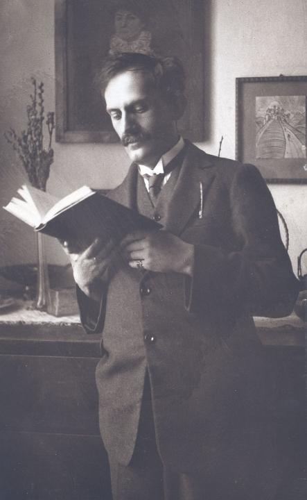 Babits Mihály kissé megdőlve, egy szekrénynek támaszkodva áll, kezében nyitott könyvet tart. A vastag, keménytáblás kiadvány lapjai szinte lebegnek a kezében, mintha épp abban a pillanatban csapta volna fel. Tekintete a könyvbe mélyed. Vajon mit olvas? Talán Dante Komédiáját? Vagy találomra, a fotó kedvéért, a polcról lekapott könyvet? A Babits Mihályról készült fénykép szimbolikus: a KÖLTŐT látjuk, kezében a nagy művel.