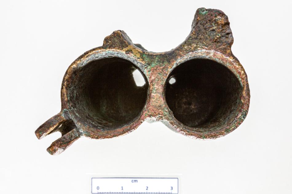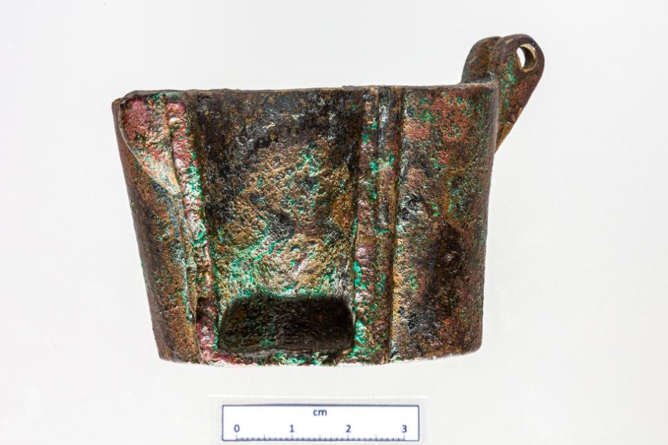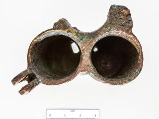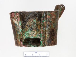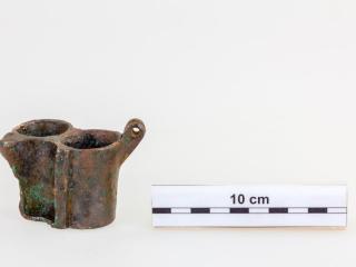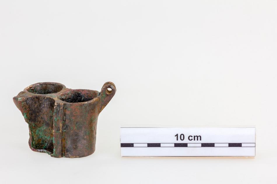 Bronzból készült, három, felfelé enyhén szélesedő, hengeres rekeszből álló, egybeöntött edény töredéke; az egyik rekesznek nagyjából a fele hiányzik. A hengerek találkozásánál azok között függőleges, enyhén kiugró borda fut végig. Az egyik henger felső részéből két, felül vízszintes helyzetű lyukkal ellátott, ferde nyúlvány emelkedik ki, amelyek eredetileg a fedél fülének csuklós pántját fogták körül (1a-c. kép). A szemközti oldalon a két hengeres rész között, a perem alatt íves lezárású, kiugró tag, amelyre egykor a fedél záródott. Mindkét megmaradt henger alján egy-egy (egészen apró, illetve nagyobb) utólagos lyuk. Az edényt – a megmaradt, hasonló példányok alapján – eredetileg háromkaréjos, csuklós záródású fedél borította, amelynek belső felére a különböző szentségek nevének latin kezdőbetűit vésték; O: oleum [cathecumenorum] (keresztelendők olaja); I: [oleum] infirmorum (betegek olaja); C: [sancta] chrisma (krizma).