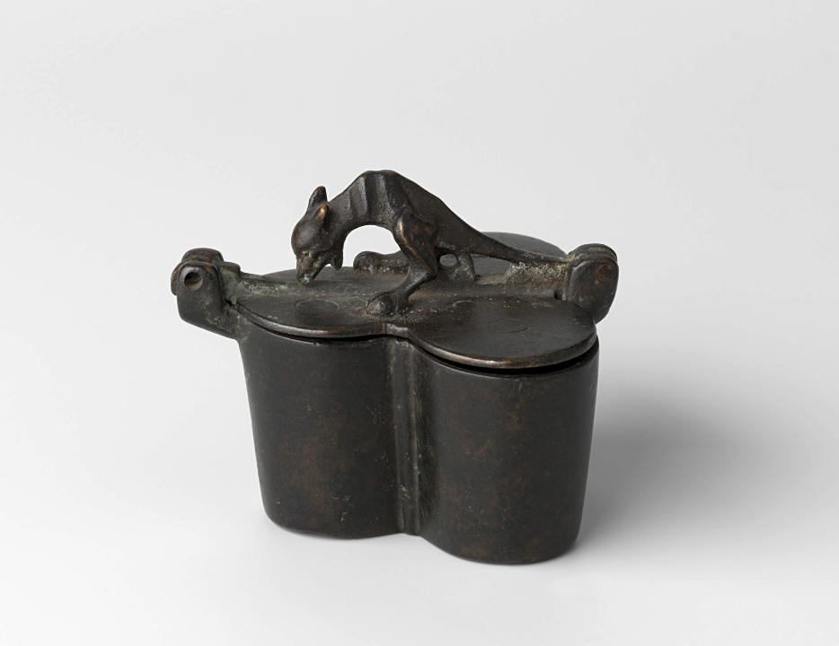 Hasonló tárgyat Magyarországról tudomásom szerint eddig mindössze egyet közöltek. Az ismeretlen lelőhelyről származó, a 15. századra keltezett kenettartó az egykori Delhaes-gyűjteményből jutott a Magyar Nemzeti Múzeumba. Ennek kidolgozása egyszerűbb a tamási példányénál, a hengeres rekeszek közti bordák hiányoznak róla. Tudomásunk van továbbá egy másik, még közöletlen darabról is, amely Kisoroszi határában került elő, talán egy elpusztult középkori kolostor környezetében. Hasonló szerkezetű kenettartó tégelyeket Európából több helyről is ismerünk (2. kép).