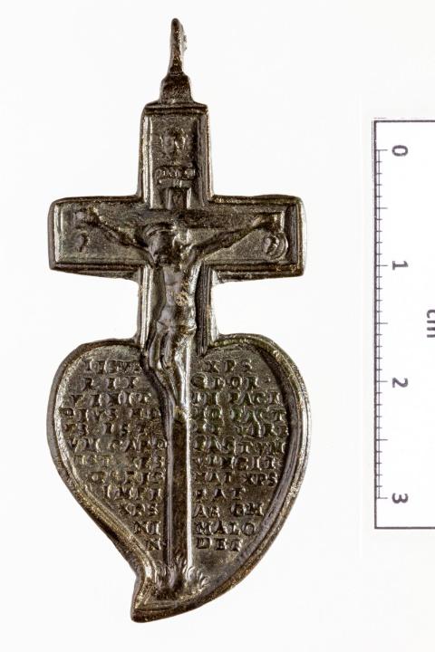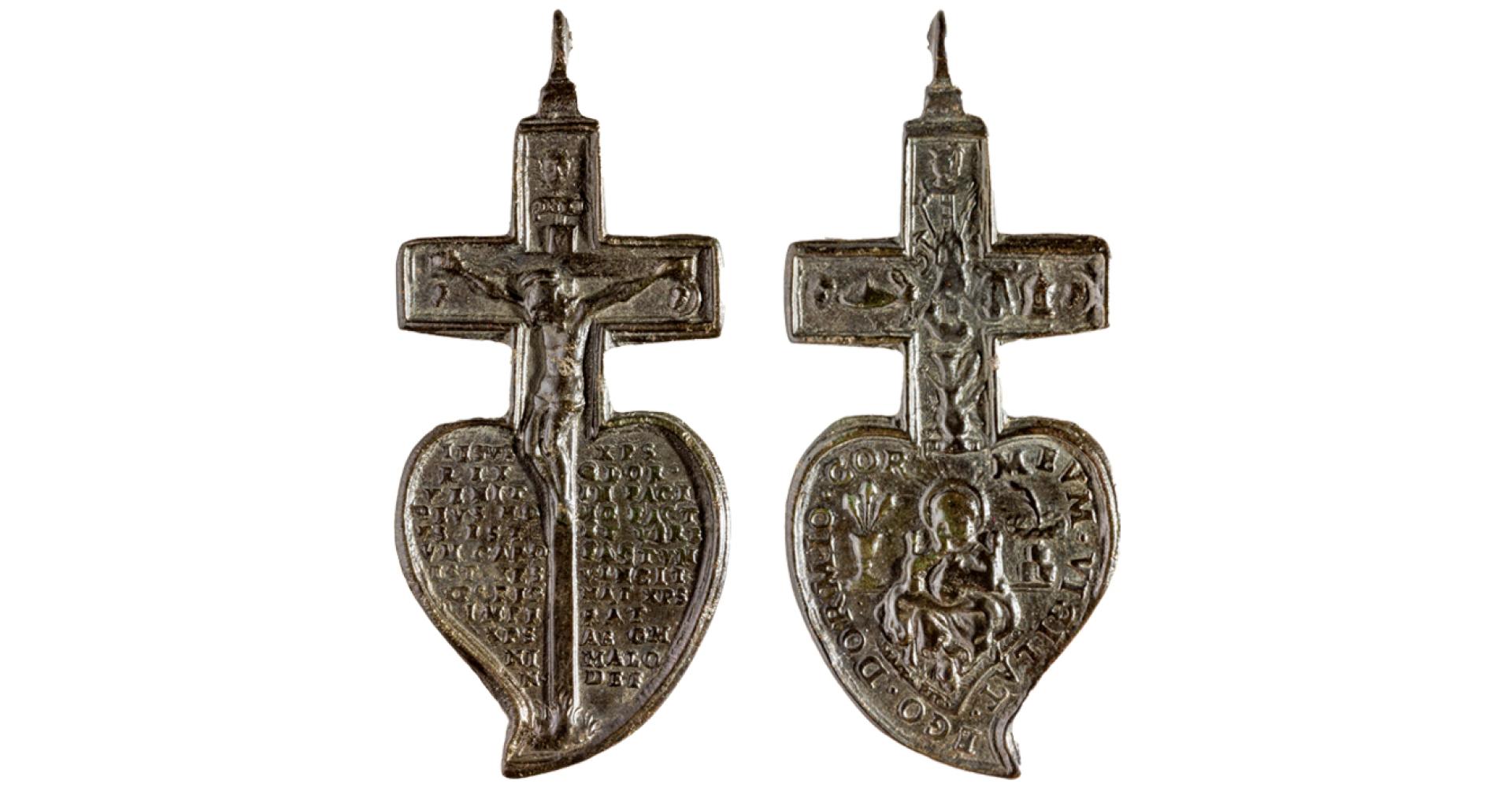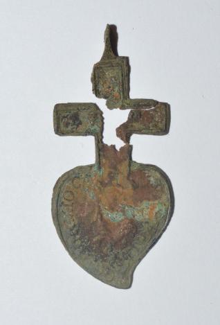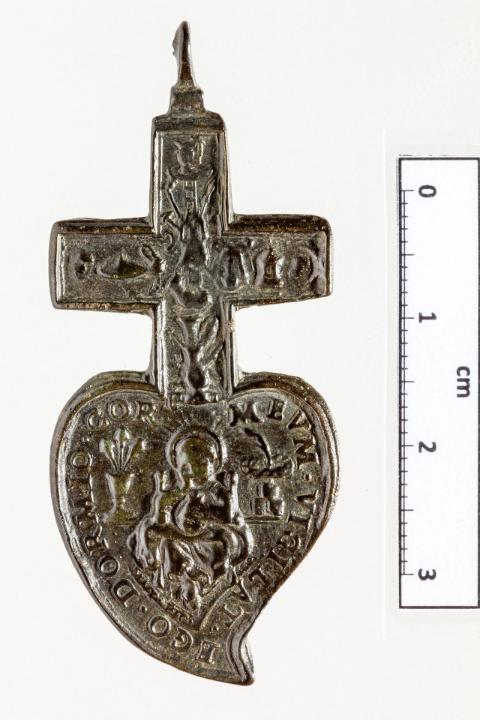 A szívmedál ónból készült függesztőfüllel. Felső része kereszt alakú, melynek függőleges szára szív formában végződik. A szív alsó, hegyes része oldalirányban elfordul. Egyik oldalán a keresztre feszített Jézus látható, feje körül glóriával. A karok felfelé állnak, egyenesek, a könyöknél enyhén megvastagodnak. A felsőtest enyhén jobbra dől, a test kissé megcsavarodik. Felsőtestén egy függőleges és két vízszintes bekarcolással ábrázolták a mellkast és az izmokat. Ágyékkötője egységes hosszúságú. A jobb lábfeje a balra helyezve. Kéz- és lábfejei ovális alakúak, ujjak nincsenek kidolgozva. Feje felett szalagban IN RI rövidítés olvasható, felette angyalfej szárnyakkal. A kereszt vízszintes szárain, a kezek alatt jobb oldalon a nap, bal oldalon a hold látható. Magának a keresztnek a kialakítása realisztikus, a kereszten ábrázolva van a fa erezete, alján fűcsomó. A szív alakú részben (mely a térdnél kezdődik) az alábbi felirat olvasható: IESVS XPS REX GLOR(IAE) VENIT IN PACE DEVS HO-MO FACT-VS EST ET VERB-VM CARO FACTVM EST XPS VINCIT XPS REG-NAT XPS IMPE-RAT XPS AB OM-NI MALO N(OS) DEF(ENDAT) = Jézus Krisztus, a dicsőség királya békében jött el. Isten emberré lett, az Ige testté lett, Krisztus győz, Krisztus uralkodik, Krisztus parancsol, Krisztus megvéd minket minden gonosztól. (Az XPS Jézus Krisztus görög nevének rövidítésére utal.) Másik oldalán a kereszt szárain a nap, a hold és a szenvedés eszközei láthatóak (kézmosó edény, létra, lándzsa, szögek, bíborköpeny, Veronika kendője, fogó, vesszőnyaláb, Júdás ezüstjeinek bugyellárisa [?], lámpás, kőkés). A szív alakú részben trónon ülő Szűz Mária látható glóriával, kezében az alvó Kisjézussal. Mellette szintén a szenvedés eszközei tűnnek fel: jobb oldalán egy kehely látható, bal oldalán töviskoszorú nádszállal és három darab dobókocka van ábrázolva. Körirata Ego dormio et cor meum vigilat. = Alszom én, de a szívem virraszt (Énekek éneke 5,2). A tárgy kidolgozása igen szép, jó állapotú.