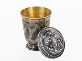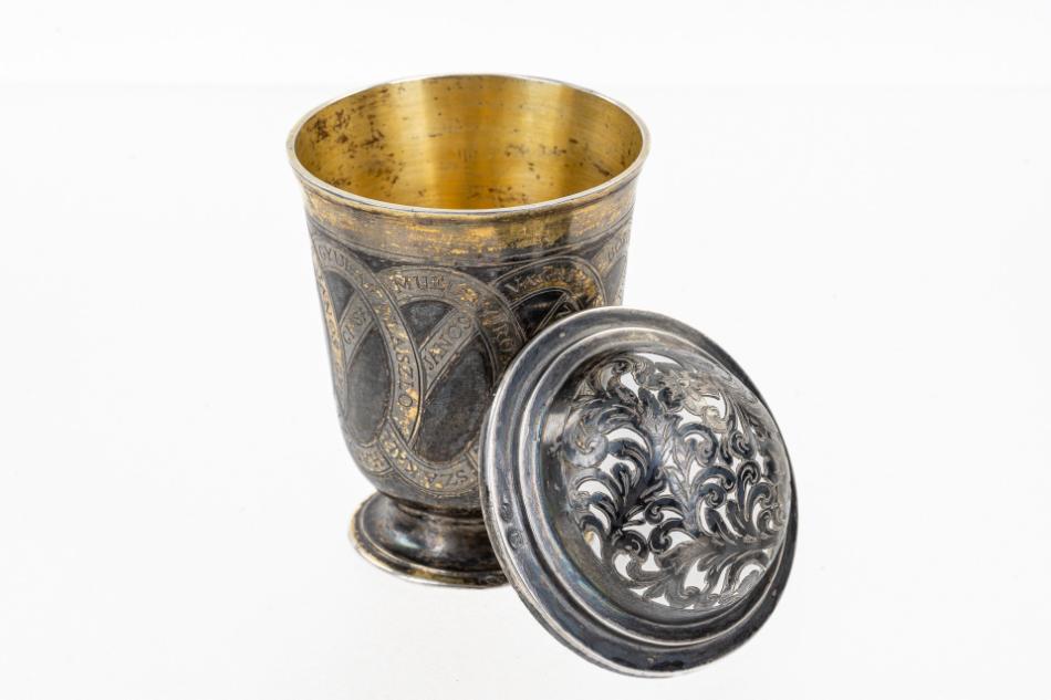 Leírás: talpas pohár fedéllel. A pohár anyaga réz, belseje tűziaranyozott, külseje ezüstözött. A testen szalagfonatban vésett felirat. Talpában alul „sculp[sit] Gabriel Ujhelyi” vésett szöveg. A talp gyűrűs peremén mesterjegy: íves lezárású, téglalap alakú formában I·SZ monogram. Az ezüstfedél kettős peremű, félgömb alakú, felülete áttört növényi motívumokkal díszitett. A fedél külső peremén BG (?) mesterjegy (a második betű olvasata bizonytalan), mellette 13-as jegy, az ezüstfinomsági próba.