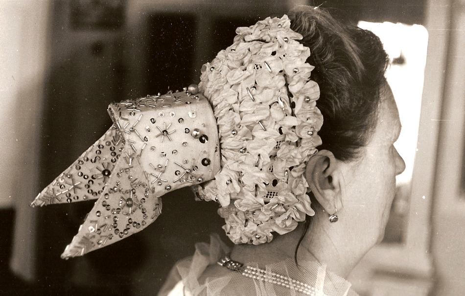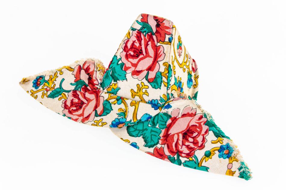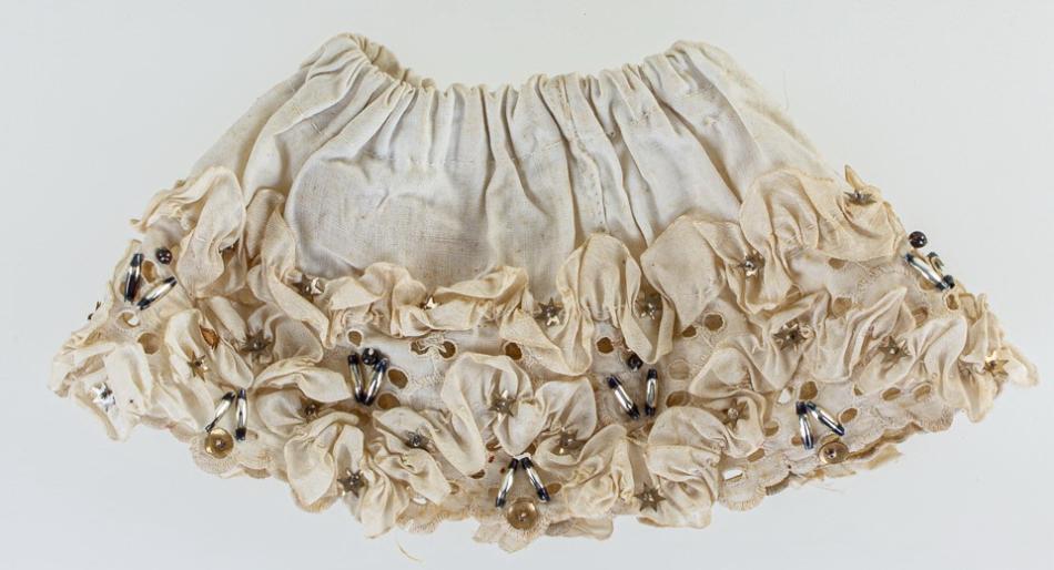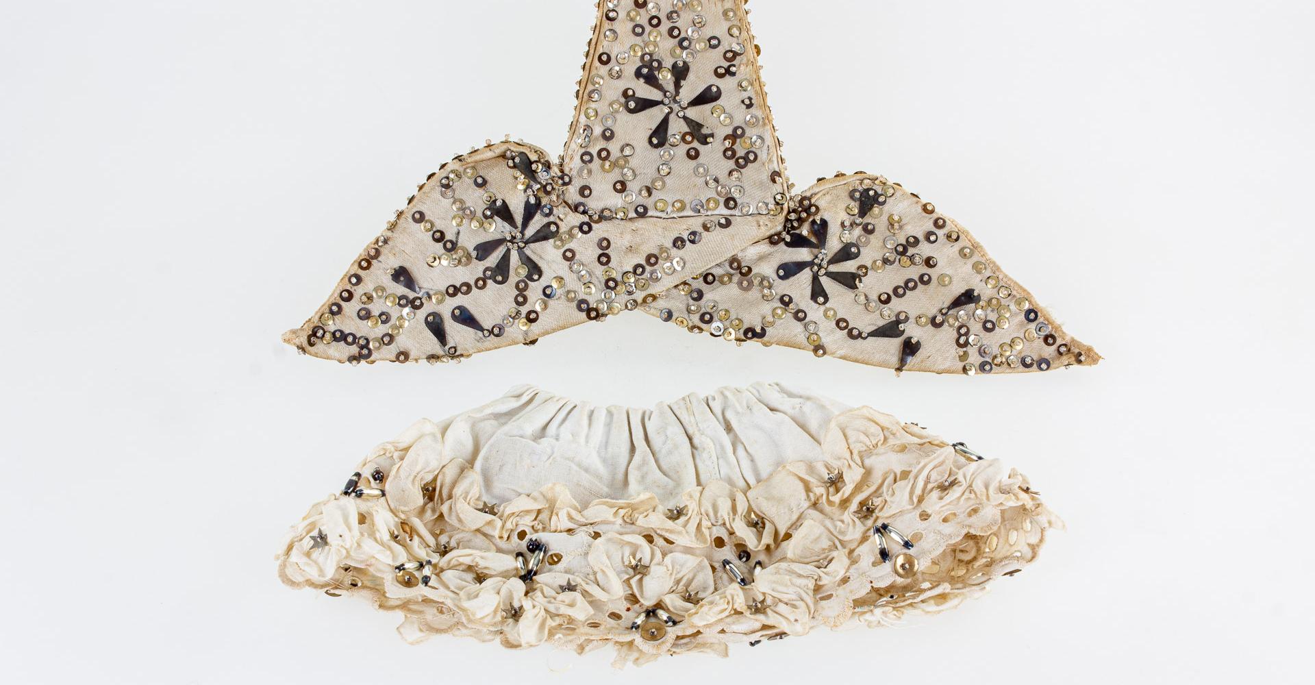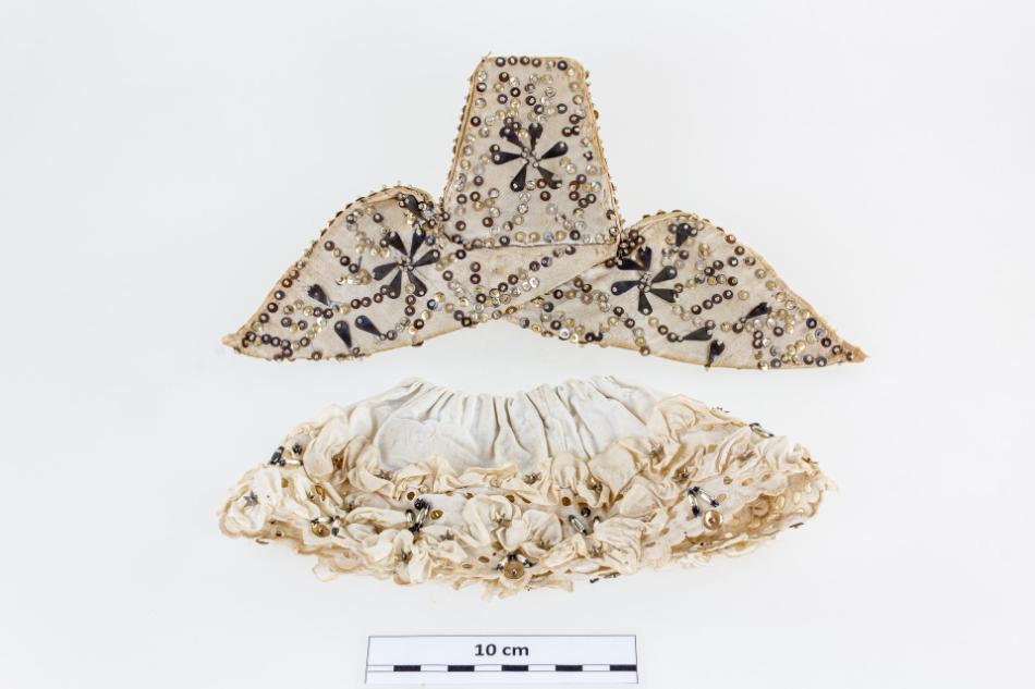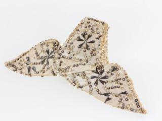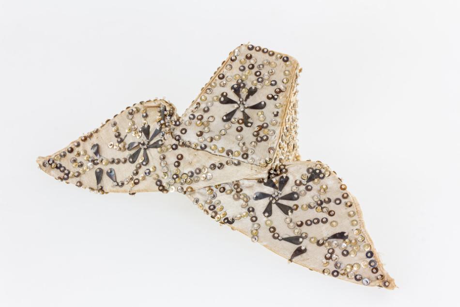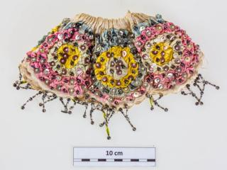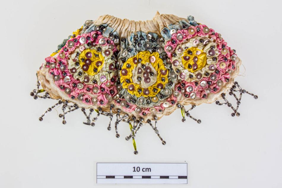 A hónap műtárgya a cintányéros pillék közé tartozik, de visszafogottabb stílusán érezhető, hogy az 1930-as években készült. A karton kontydobozra húzott fehér taftselyem anyagra virágszirom és korong alakú flittereket, továbbá fehér üveggyöngyöket varrtak, melyek alakja stilizált virágformát mutat.