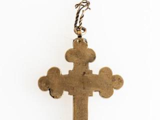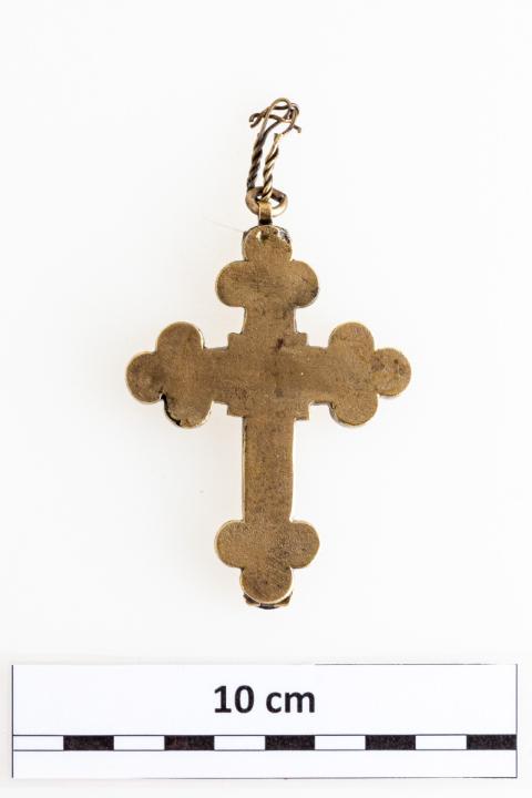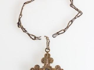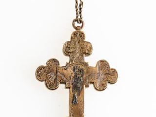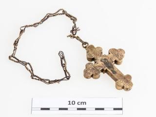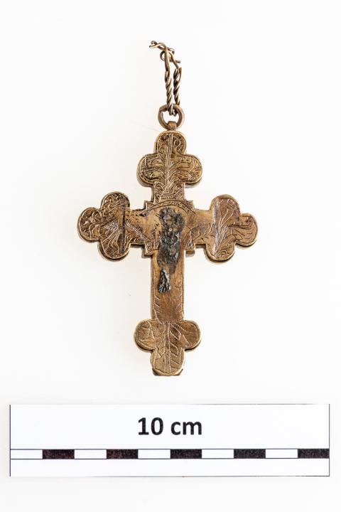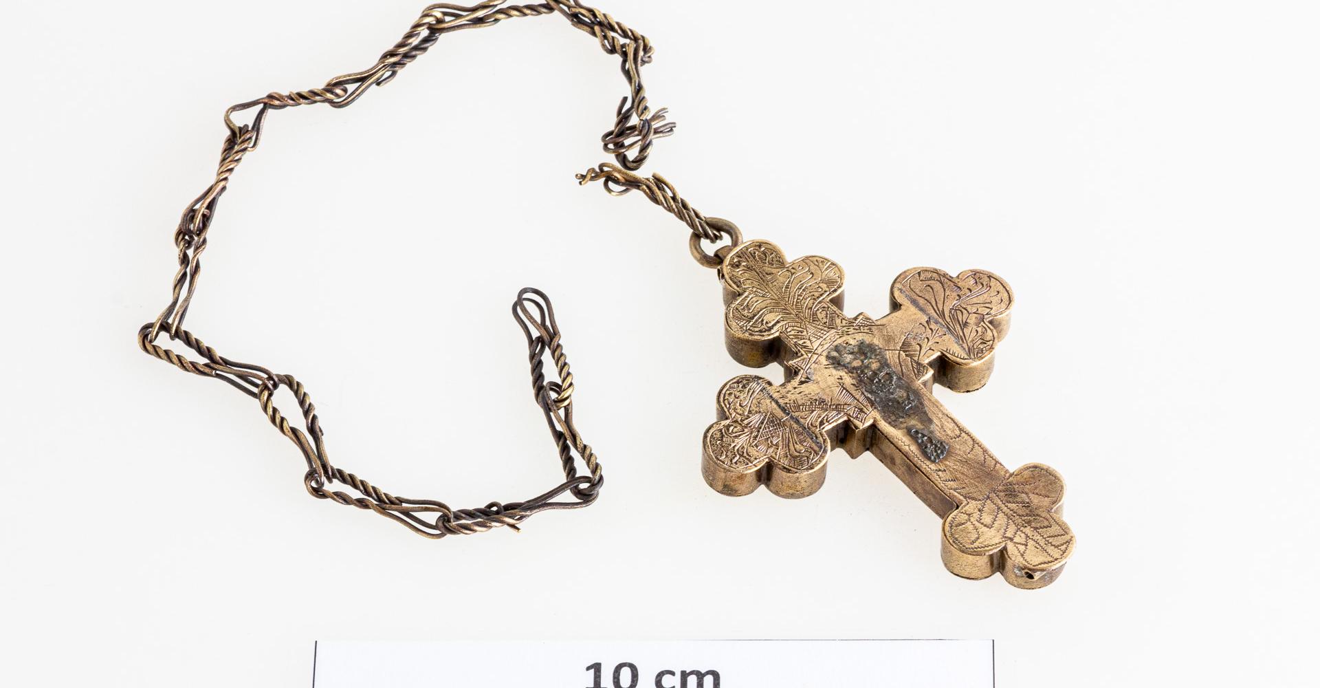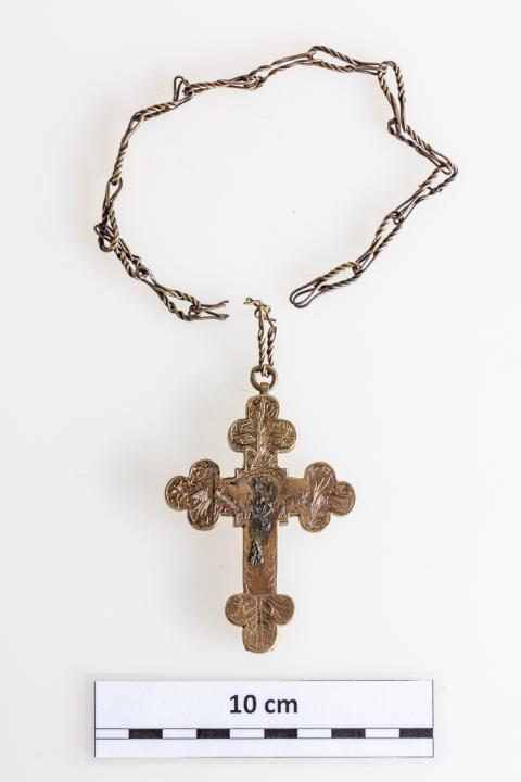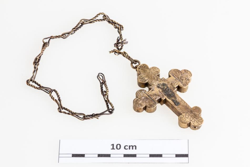 18–19. századi, bronzból készült, karéjos végekkel kialakított, felső részén függesztőfüllel, benne karikával és kétrét hajtott sodrott bronzhuzaldarabokból csavart lánccal ellátott mellkereszt. Hátlapja rá van forrasztva, a felső csapszegekkel volt rögzítve, hogy kinyitható legyen. Belső része üreges, különböző ereklyék tárolására alkalmas. Fedlapján díszítés látható: a tárgy felső részén bekarcolt, alul pontsoros növényi ornamentika a karéjos végeken. Középen forrasztás nyomai, melyek feltehetően egy kisebb plasztikát rögzítettek. Restauráláskor, a felnyitást követően szövetmaradványokat találtunk a tárgyban.